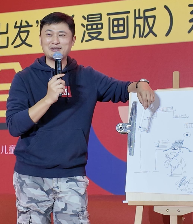 【,】黑白线条勾勒出马头墙,几笔之间,墙下头戴长翅帽、身着圆领官袍、额上弯月牙的包拯形象跃然纸上。这幅仅用两分钟画出的漫画,是“混子哥”陈磊在黄山书会上赠给安徽读者的礼物。11月15日至17日,2025中国黄山书会在合肥滨湖国际会展中心综合馆举行,15日下午,漫画式科普IP“混知”创始人“混子哥”陈磊在“边画边讲——跟着混知哥纸上游中国‘美丽中国·从家乡出发(漫画版)’读者见面会”上亮相。 陈磊带领混知团队致力于通过图像化、娱乐化、脉络化的方式解读传播知识,降低学习门槛,以提高大众的学习兴趣和效率,其团队主创的“半小时漫画”系列丛书,发行量超过3000万册,成为现象级知识IP。直言安徽“低调奢华”2024年,混知团队创作的《美丽中国·从家乡出发(漫画版)》一经推出就吸引了大量读者,尤其是青少年儿童读者。这套书讲述了各省市的过去和今天、自然和人文,书中幽默风趣的表达方式配以条漫的形式,让有些难懂的概念活起来。谈到该系列的创作初衷,陈磊说:“中国是有细胞的,这个庞然大物,我们很难用一个词、一句话、一个标签去描绘,但是我至少可以给你34个词,这套书的目的就是让大家能够看到中国这个庞然大物的每一个细胞。”本系列共35册,计划分三年出版,其中介绍安徽地理人文的《安徽正在说》属于首批出版。谈到安徽,陈磊用“低调奢华”来形容,陈磊的家乡江西与安徽相邻,他觉得作为一衣带水的邻省,两地文化有相似之处。“在我们长大的那样一段岁月里,我觉得安徽还是个蛮低调的地方,感觉它是个默默无闻的地方,跟我们老家一样。但是你真的去了解,你会发现很多了不起的东西、了不起的人,一直在默默地发挥着作用。”从图文漫画到出镜边画边讲今年六月,陈磊在多个视频平台新开账号“混子哥边画边讲”,至今单抖音账号粉丝已突破1300万,获赞超过4500万。从图文到视频,他用不同的表达形式,拓宽科普的路径。视频中,一支马克笔、一块白板,几笔勾勒出的人物和画面,让繁杂的知识脉络顿感清晰。对陈磊而言,无论是图文、动画还是真人出镜边画边讲,都只是表达形式的不同,运用的是同样的思维逻辑,“我怎么样在黑板上画,其实就是源于我当年怎么样在纸上画画。”但他也坦言,视频和图文的表达也需要创作逻辑的调整。“纸上是静态的,当我读到下面没读懂可以再翻回上面,视频不可以,所以视频的特点就在于我要把控节奏,让你跟着我每分钟每秒钟(看)过来,不需要你回去,所以图文可操作的余地就会多一些,这两种阅读方式,会带来不一样的思考和创作逻辑。”数学学渣要做“漫画微积分”以第二十一届中国黄山书会为契机,陈磊也对在场的小朋友们送上建议:“书不一定要读得特别多,但是我希望你读得特别杂。” 陈磊觉得,当读的书杂了之后,不容易陷入茧房之中。“简单来说,如果你特别爱读虚构故事,你对世界的理解可能会脱离真实、过于理想化,你如果只读科学,你认知的这个世界可能又过于冰冷,缺少人文情怀,所以不管是沉浸在哪一个领域太深,我认为都不算好事,所以我认为人读书应该读杂。”而混知团队科普的领域涉及经济、历史、文化、汽车等,也是科普IP中的杂学家。陈磊也向大皖新闻记者提到,团队下一步要推出“漫画微积分”的作品,“我数学很烂,所以现在我特别想补一下我的数学,这是我自己的弱项,当年我微积分学得很烂,所以我要好好学一学。”大皖新闻记者 于源绮