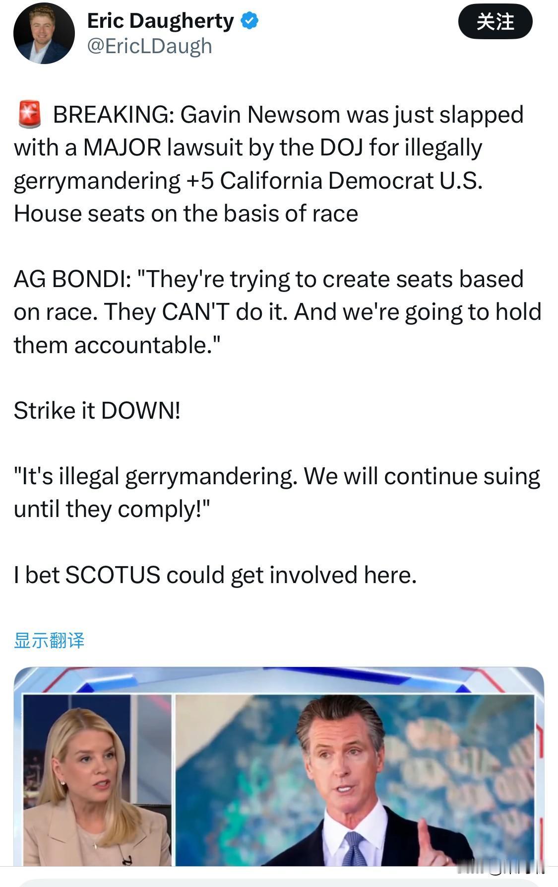 2025 年 11 月 13 日,美国司法部宣布对加州州长纽森和州务卿雪莉·韦伯提起法律诉讼。 司法部指控加州通过的 第50号提案 (Proposition 50) 所采用的新国会选区地图违反了美国宪法第十四修正案的平等保护条款。 诉讼的核心在于,司法部认为该计划要求或主要以种族(特别是拉丁裔人口统计数据)为基础进行选区划分,目的是推进政治利益,而非遵循中立的原则。 该提案旨在回应德克萨斯州等共和党控制的州为本党争取国会席位的类似努力。支持者称,新的选区划分可能有助于民主党在 2026 年的中期选举中多获得几个众议院席位(有报道称可能增加五个席位的胜算)。 司法部是加入了一项由加州共和党人提起的现有诉讼,而非完全独立发起一项新诉讼。 简而言之,这起诉讼可能对 2026 年美国众议院的控制权产生影响。