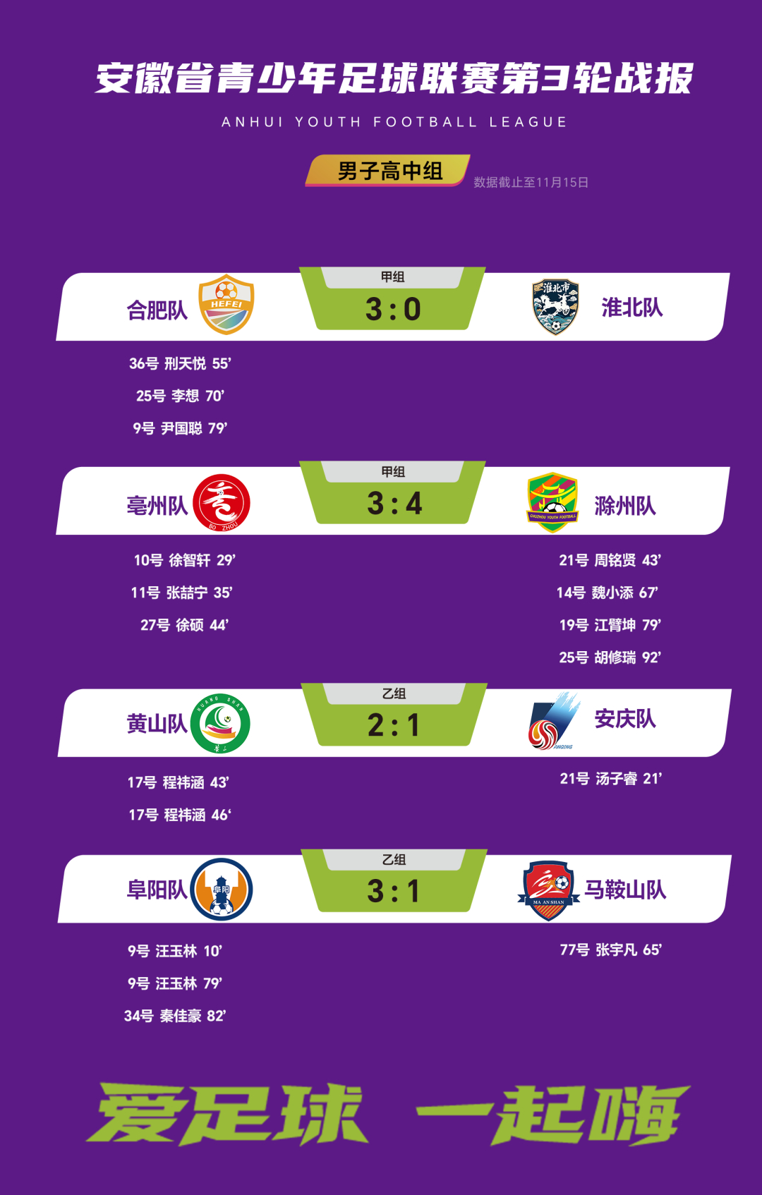 【】11月15日,安徽省青少年足球联赛官方公众号发布11月15日徽青赛男子高中组第3轮战报。其中,合肥队以3:0战胜淮北队,滁州队以4:3战胜亳州队,黄山队以2:1战胜安庆队,阜阳队以3:1战胜马鞍山队。()