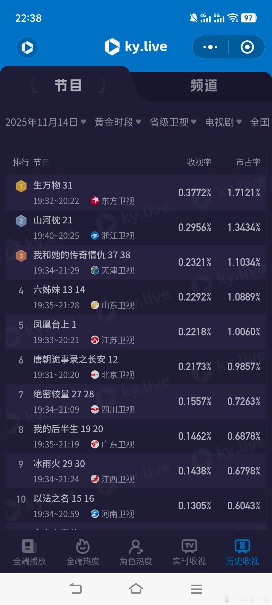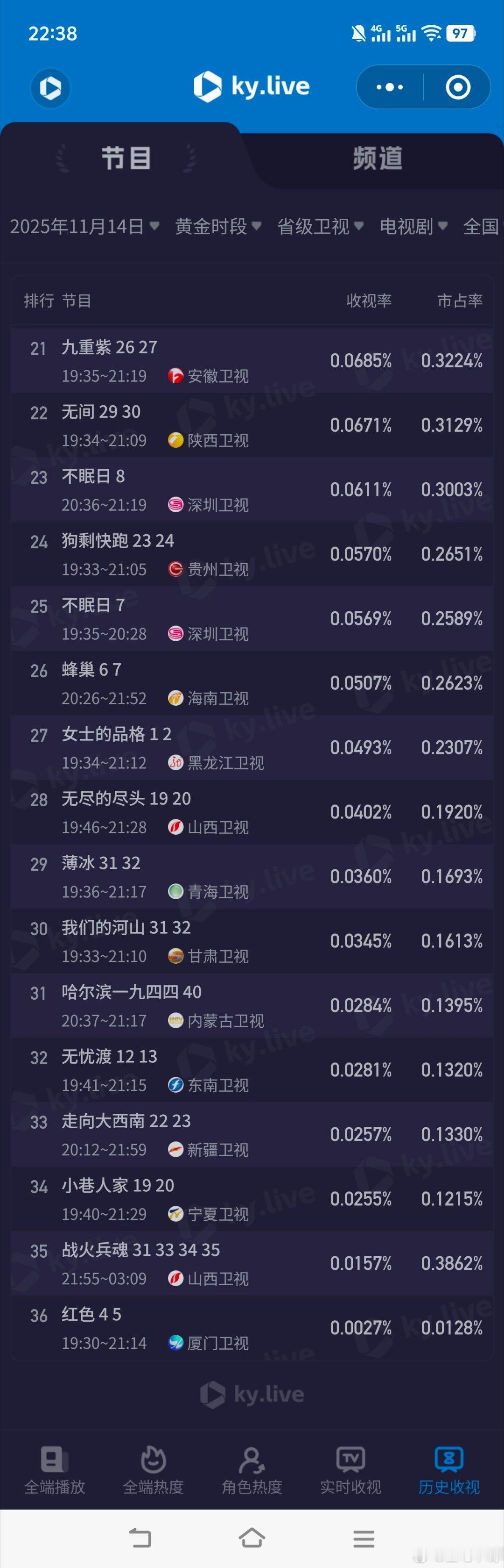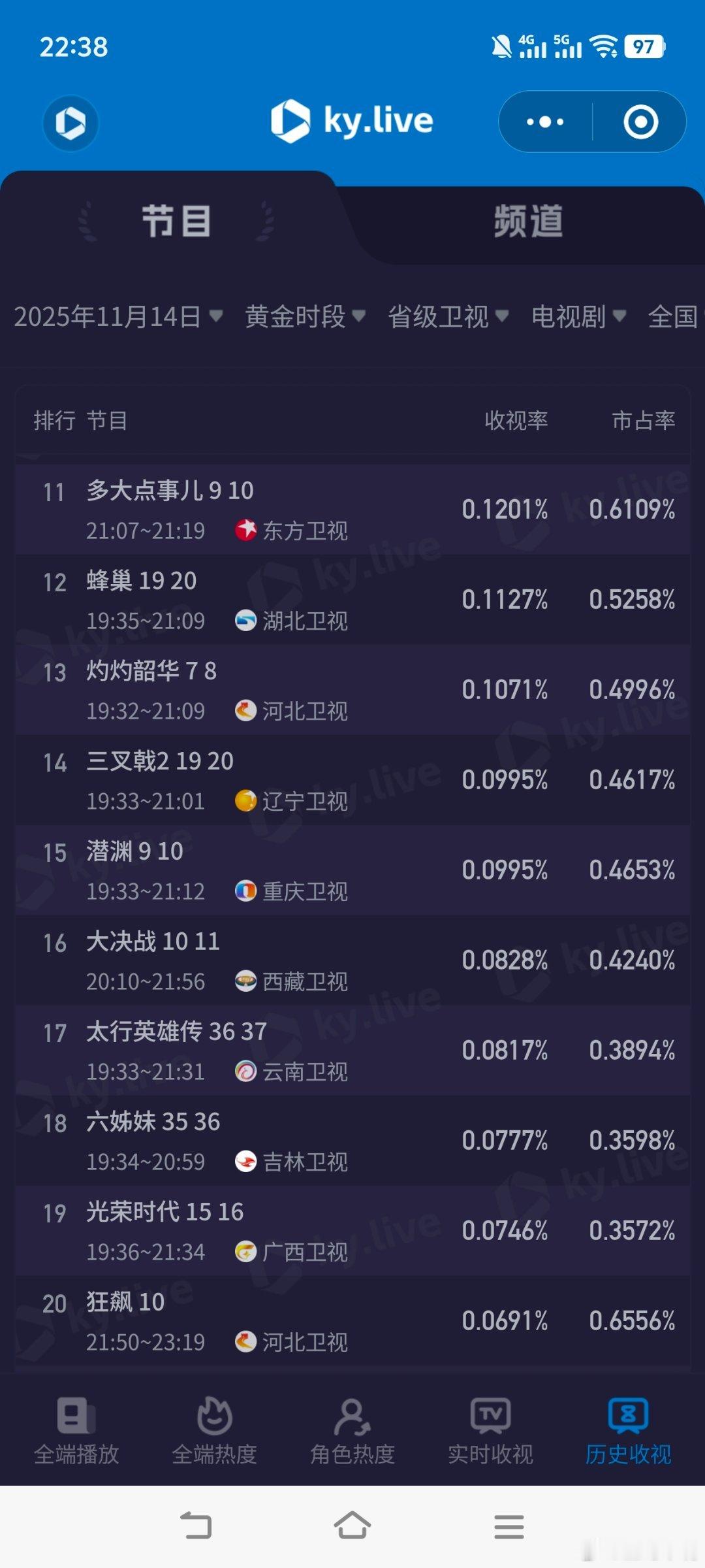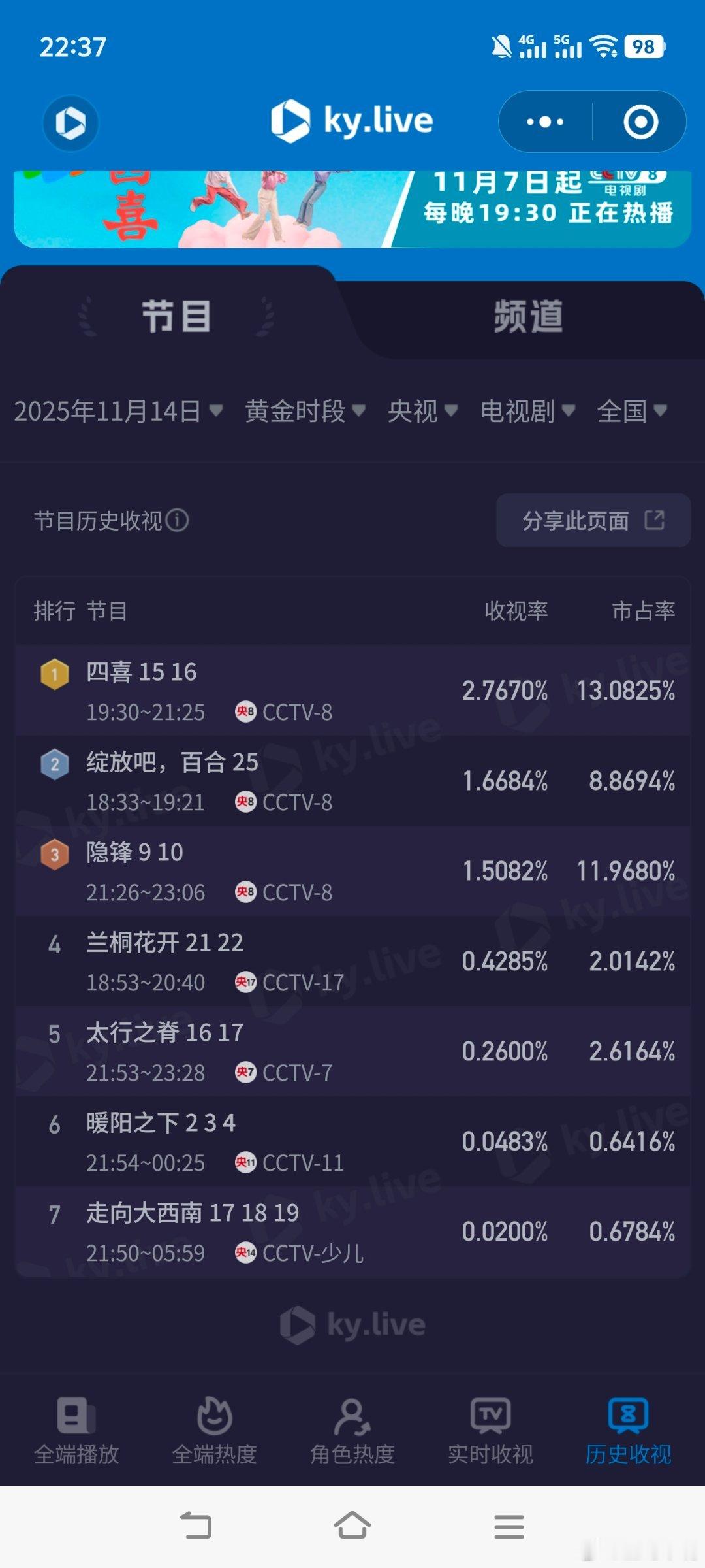 11月14日cvb收视率!四喜2.271,酷云2.7670,系数0.821隐锋1.618生万物0.406,酷云0.3772,系数1.076山河枕0.330,酷云0.2956,系数1.116唐诡3 0.209,酷云0.2173,系数0.962凤凰台上0.175,酷云0.2218,系数0.789