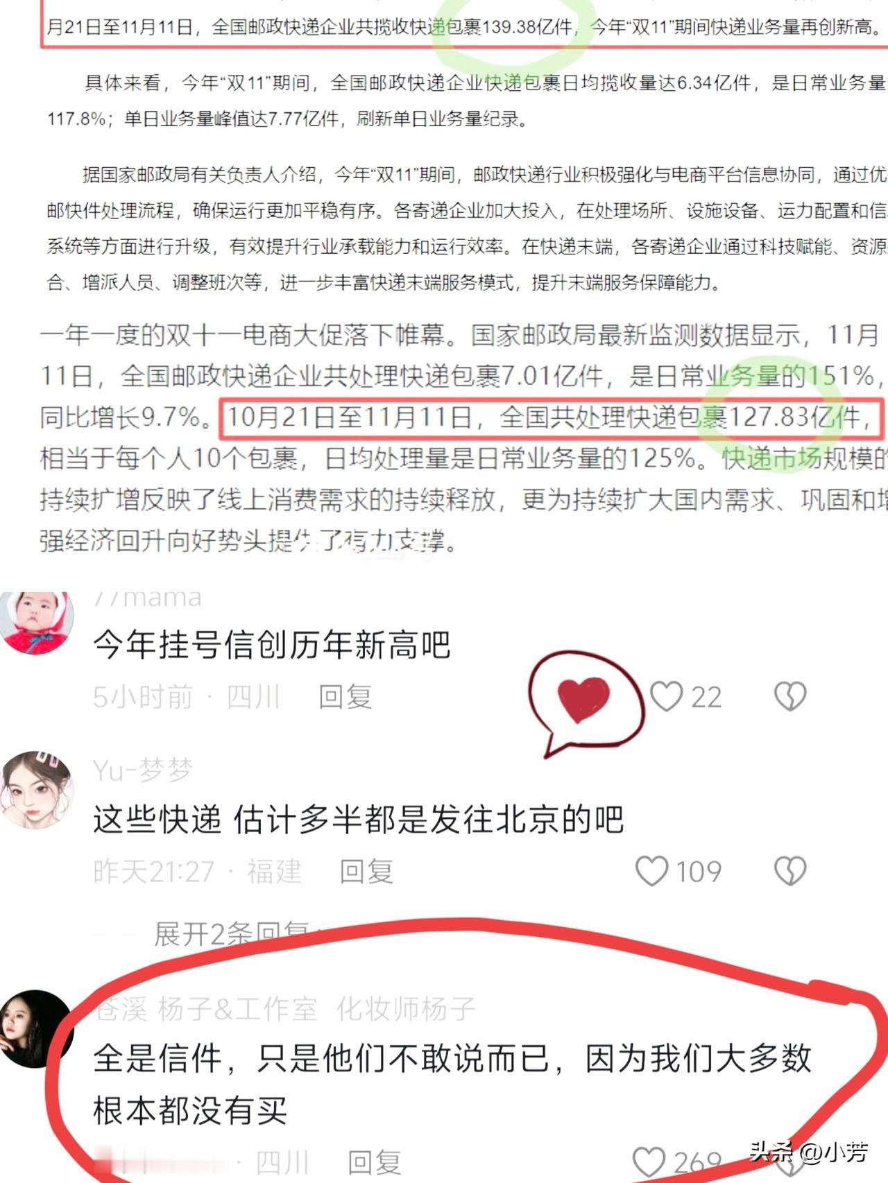 从十月21号开始 邮政快递爆增139亿 他们说是快递旺季双十一的功劳 网友说双十一没购物 没猜错的话大部分信件飞往了北京 官方说这是经济回暖的信号 可不少网友直言没参与双十一血拼 还调侃这些包裹装的是“信念” 其实不管是网购包裹还是特殊信件 这暴增的数据背后 都是普通人的牵挂与期待 快递量飙升不只是消费活力 更藏着大家对生活的 热忱和对家国的心意 每一个飞驰的包裹 都是情感与需求的传递 这份热度远比单纯的“购物季”更有分量 你双十一剁手了吗