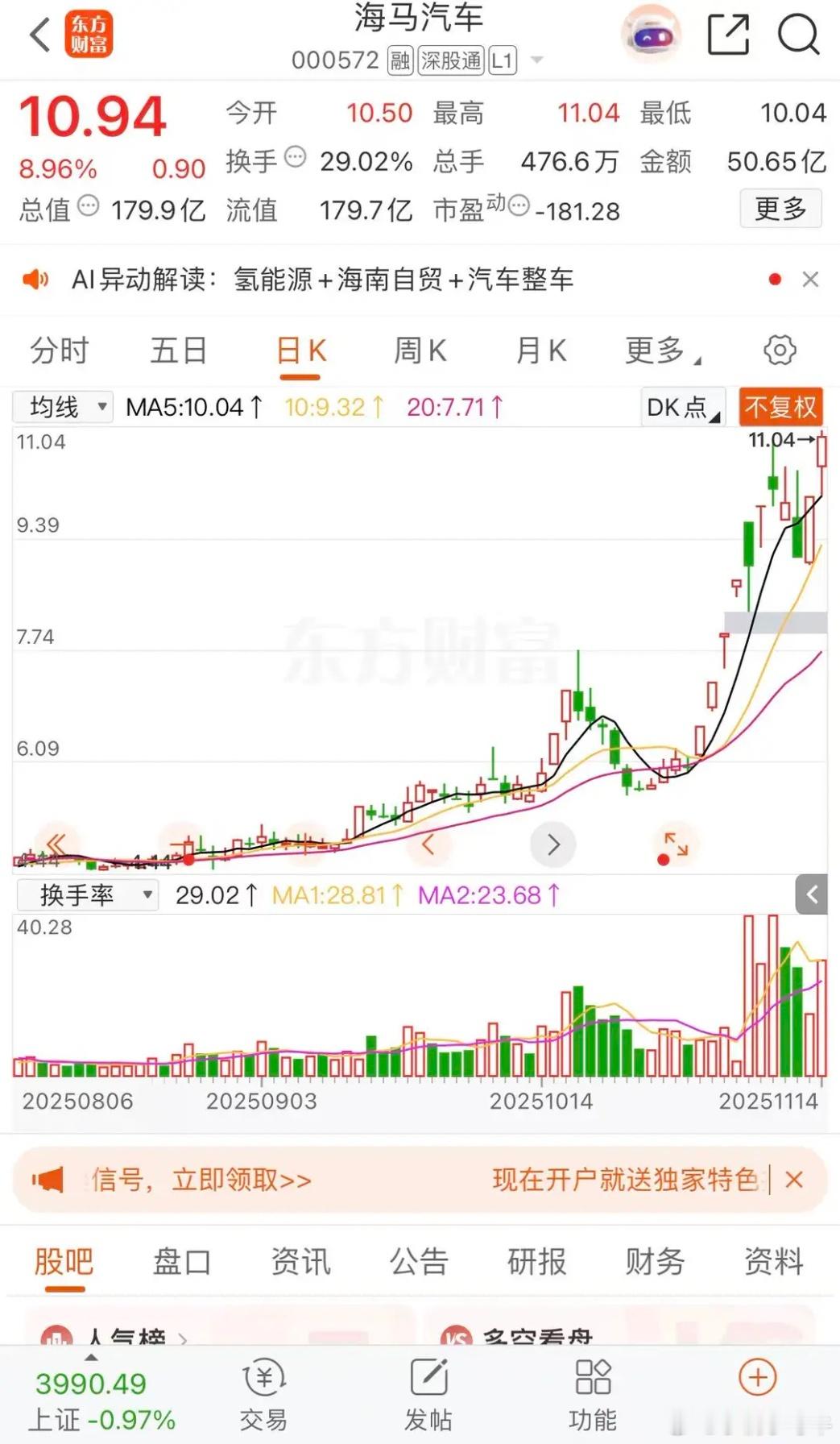 海南股海马汽车对比福建股平潭发展海马汽车尾盘炸板收盘报收10.94元每股,成交金