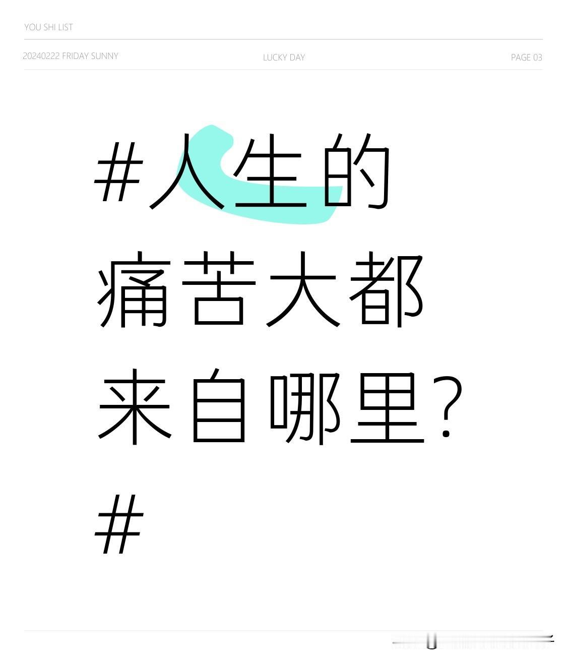 人生的痛苦大都来自哪里? 人生的痛苦大都来自贫穷和对未来的恐惧。 金钱能解决多数问题,贫穷是痛苦主因。不懂致富之道,让很多人陷入经济困境。贫穷影响恋爱、婚姻,“贫贱夫妻百事哀”,柴米油盐都需钱,为了挣钱养家,很多人背井离乡,缺失情感陪伴。 对未来的恐惧也会带来痛苦。就像中年男人的“35岁危机”,担心被替代又没足够储蓄,焦虑感长期存在。可未来本就不确定,一直担忧只会陷入内耗。所以要活在当下,把痛苦压缩在当下,别让它“延长”。