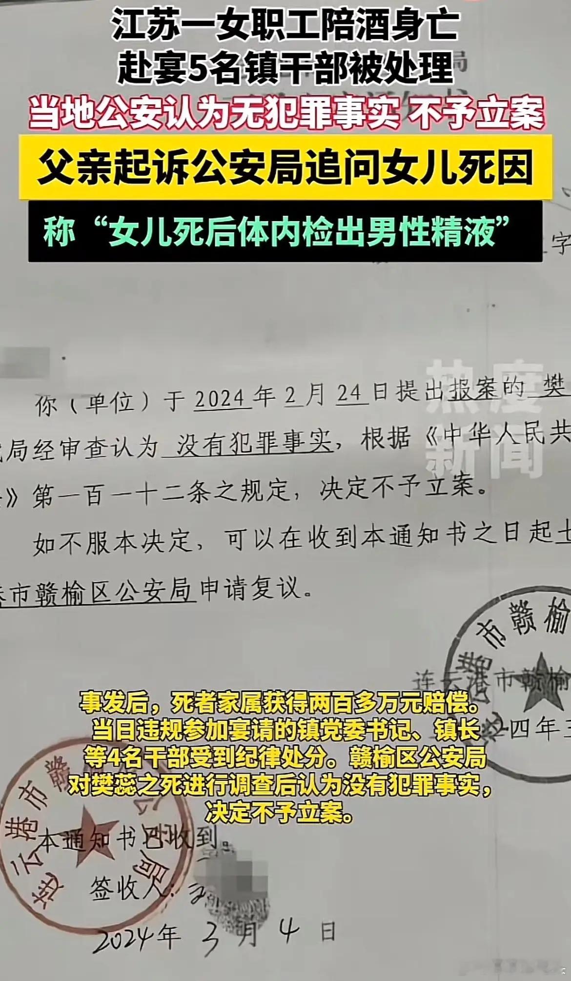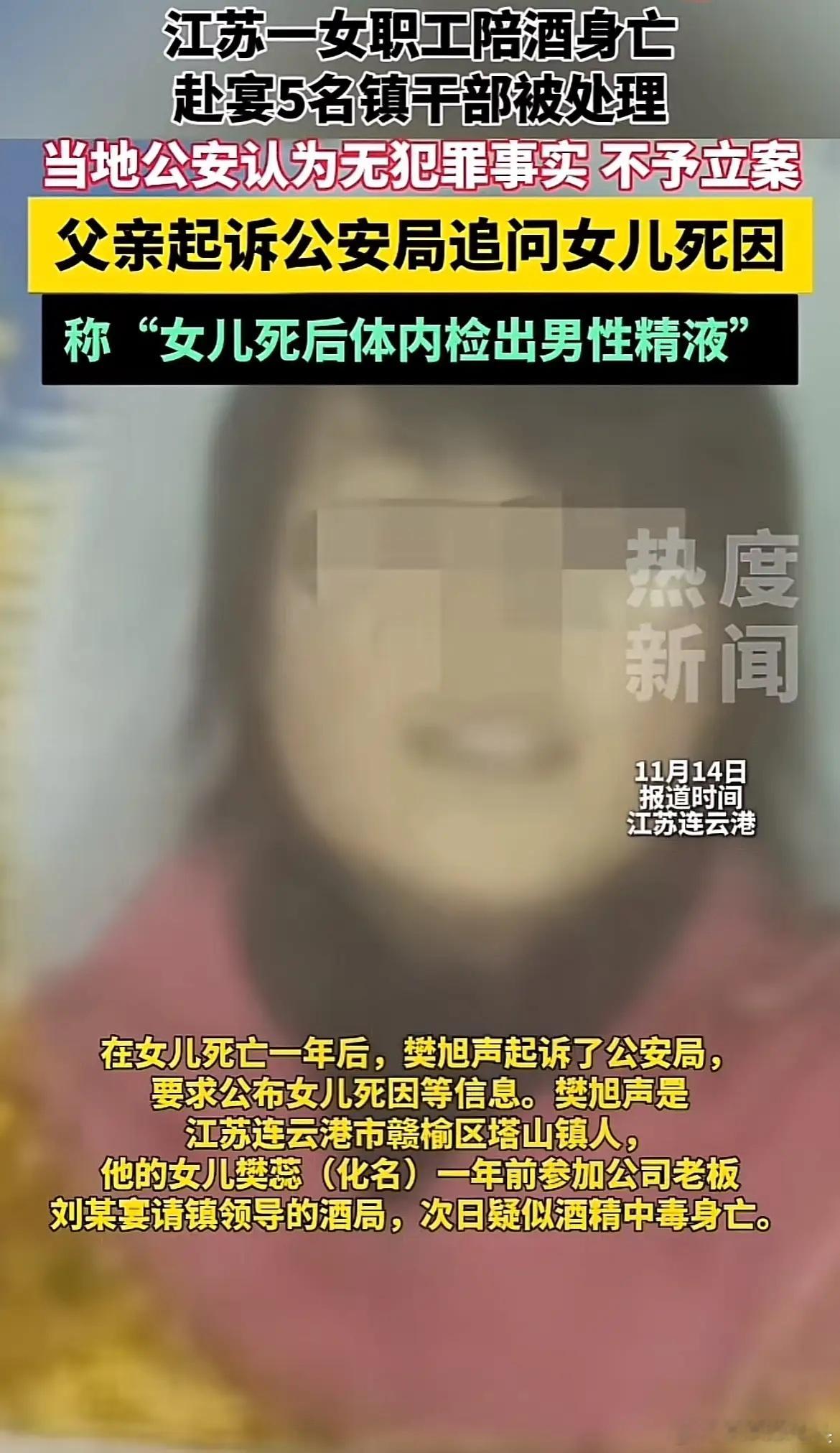 连云港女职员陪酒后死在老板床上,体内检出精液,家属死活不信警方说的酒精中毒。拿了235万赔偿,发现这情况,警方还说女职员和老板是情人关系,信息也不公开,家属直接把警方告上法庭。案子已经开庭,结果还没出来。一条人命不能糊里糊涂没了。警方调查透不透明,死因认得对不对,这些都关系到司法公信力。老百姓就盼着查个水落石出,给死者一个公道,也让大家安心。觉得说得在理