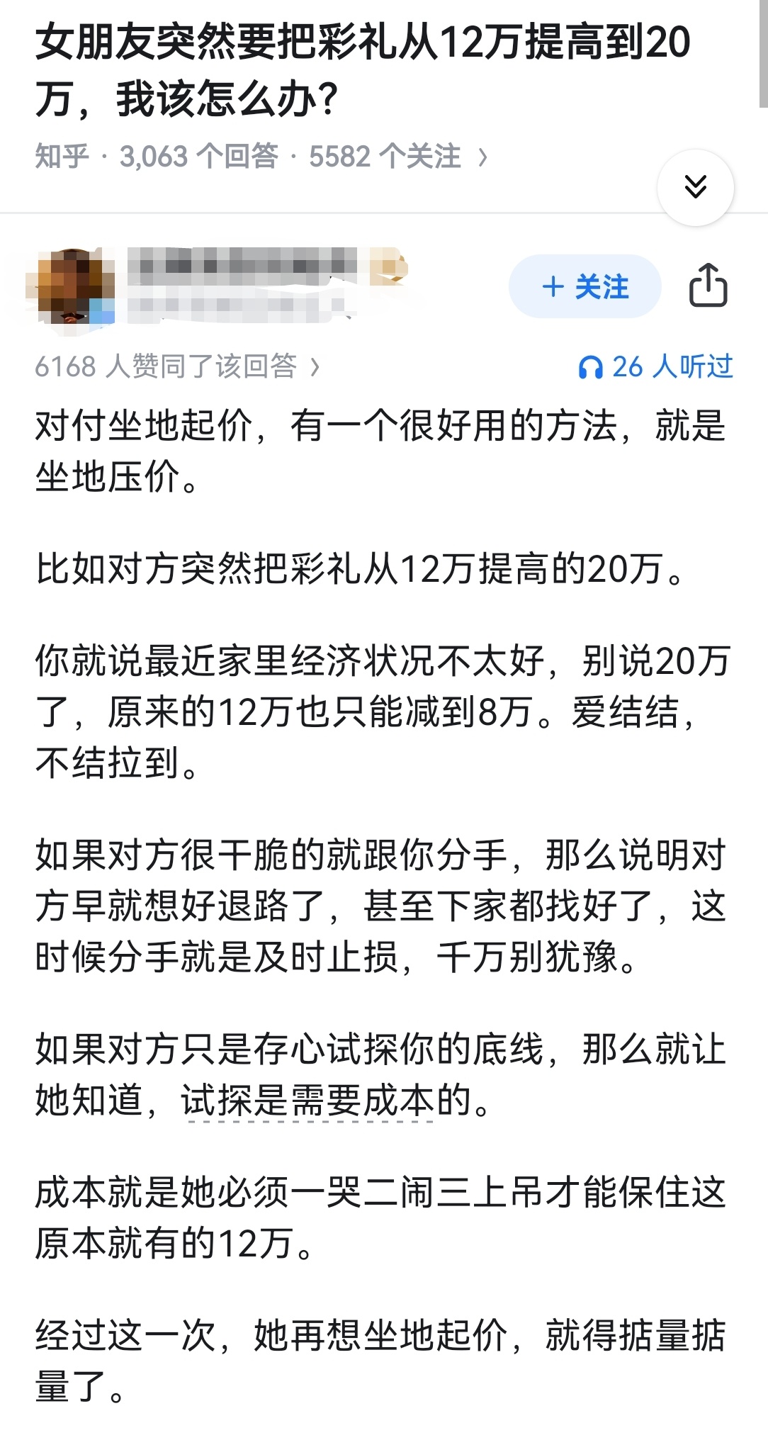 女朋友突然要把彩礼从12万提高到20万,我该怎么办?