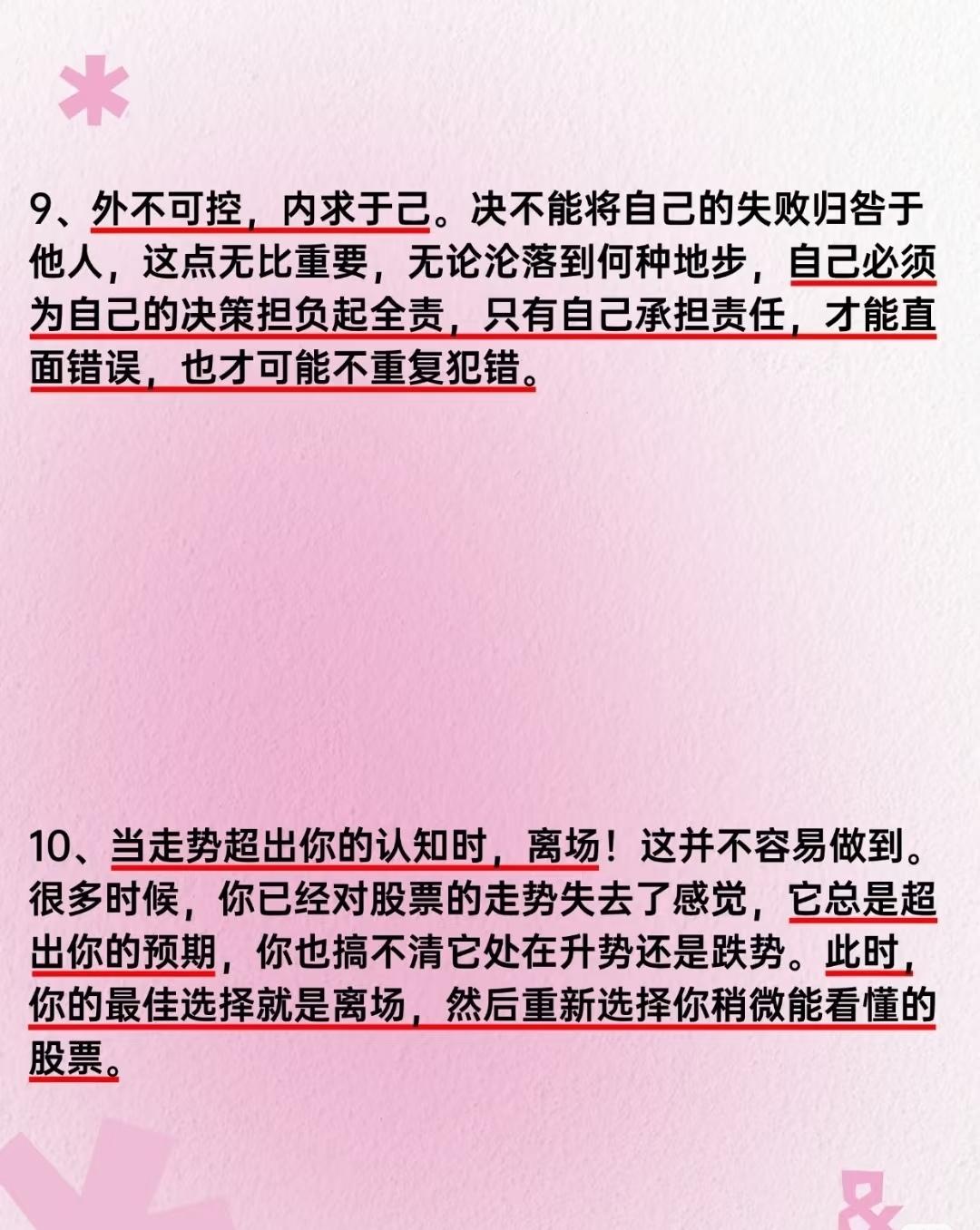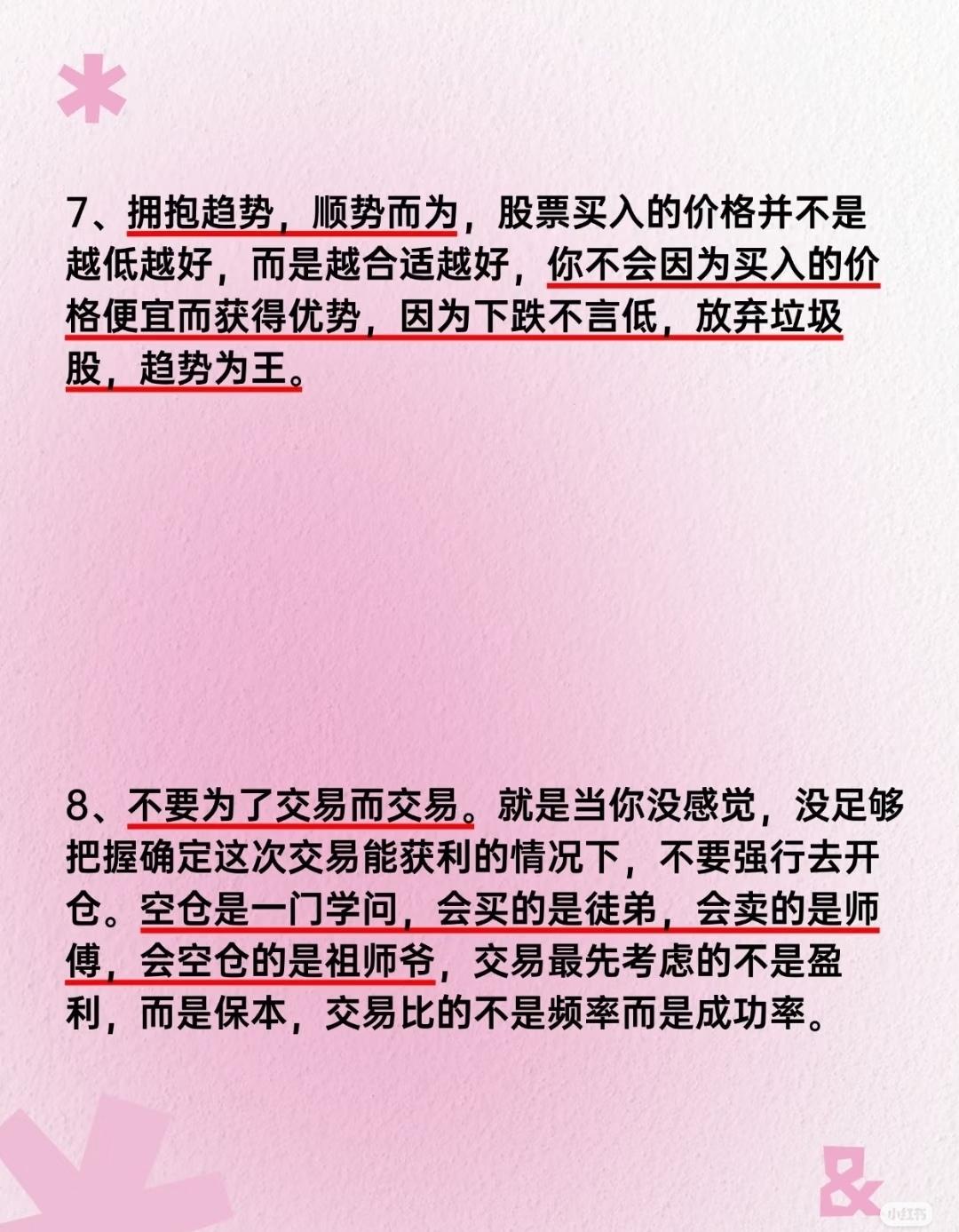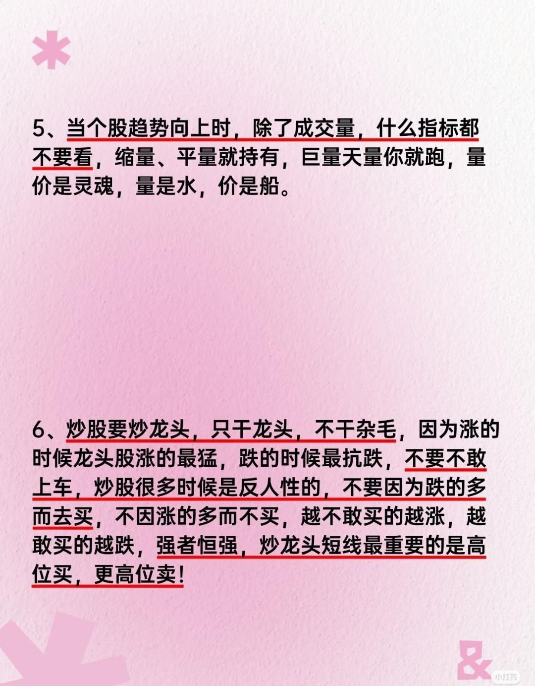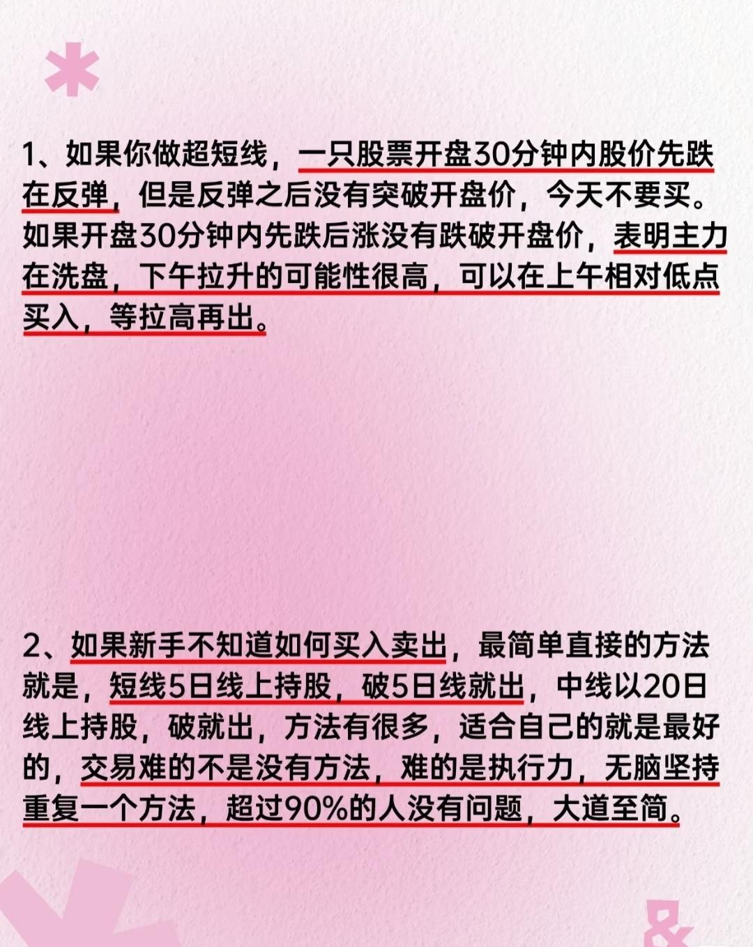 “股市天才的退役赠言”及相关投资建议,核心内容可以总结如下: 一、最安全稳健、简单却赚钱的股票买入法(适合小资金快速做大) 这套方法强调“简单策略+严格执行”,核心在于选对方法并坚持,而不是频繁更换或盲目操作。以下是具体要点: 一、超短线与新手买卖策略 1. 超短线交易策略: - 开盘30分钟内,若股价先跌后反弹但未突破开盘价,说明主力可能在洗盘,今天不要买; - 若股价先跌后涨且没有跌破开盘价,意味着主力洗盘后可能下午拉升,可在上午低点买入,拉高后卖出。 2. 新手买卖方法(适合大多数投资者): - 短线看5日线:线上持股,跌破5日线就卖出; - 中线看20日线:线上持股,跌破20日线就卖出; - 强调执行力比方法本身更重要,无脑坚持一种适合自己的方法,超过90%的人都能成功,大道至简。 二、主力行为与买卖时机判断 3. 主力试盘信号: - 股票上午平静,下午开盘突然拉升,通常是主力在试盘或试盘突破,应重点关注这类股票,可能有大涨机会。 4. 主升浪介入时机: - 当主升浪已经形成且没有明显放量,应果断介入; - 缩量上涨或缩量下跌,趋势未破时继续持股; - 如果出现放量下跌且趋势破位,要快速减仓止损。 三、量价关系与龙头股策略 5. 量价是灵魂: - 当个股趋势向上时,只需关注成交量——缩量或平量就持有,巨量/天量就是卖出信号; - 强调:“量是水,价是船”,量价配合是核心。 6. 只做龙头股: - “只干龙头,不干杂毛”,因为龙头股涨得最猛、跌得最抗; - 不要因为跌得多就去抄底,也不要因为涨得多就不敢买,强者恒强; - 炒龙头短线更重要的是:高位买,更高位卖,这是反人性的,但也是盈利关键; - 不要不敢上车龙头,这是心理关。 四、趋势为王与交易纪律 7. 拥抱趋势,顺势而为: - 股票买入价格不是越低越好,而是要“合适”,不要想着抄底,“下跌不言底”; - 放弃垃圾股,趋势为王,只做处于上升趋势中的股票。 8. 空仓是最高学问: - 不要为了交易而交易,没有把握时不要强行开仓; - “会买的是徒弟,会卖的是师傅,会空仓的是祖师爷”; - 交易首要考虑保本,而非盈利,比的是成功率,而不是交易频率; - 空仓本身就是一种保护,是一种智慧。 五、心态与认知管理 9. 自省与责任: - “外不可控,内求于己”,不要把失败归咎于市场或他人,自己必须为决策担负全责; - 只有敢于面对错误,才能不断修正,持续进步。 10. 认知边界意识: - 当走势超出你的认知,看不懂、没感觉时,最佳选择就是离场!; - 不要强行参与看不明白的股票,应该重新选择你看得懂、有把握的标的,这是风控的重要一环。 总结一句话: 炒股制胜的关键不在于复杂的技术,而在于简单有效的方法 + 强大的执行力 + 清晰的自我认知与纪律。 只要选对一套适合自己的策略(比如5日线/20日线持股法、龙头战法、趋势跟随等),严格执行,控制风险,耐心等待属于自己的机会,小资金也能稳健做大。