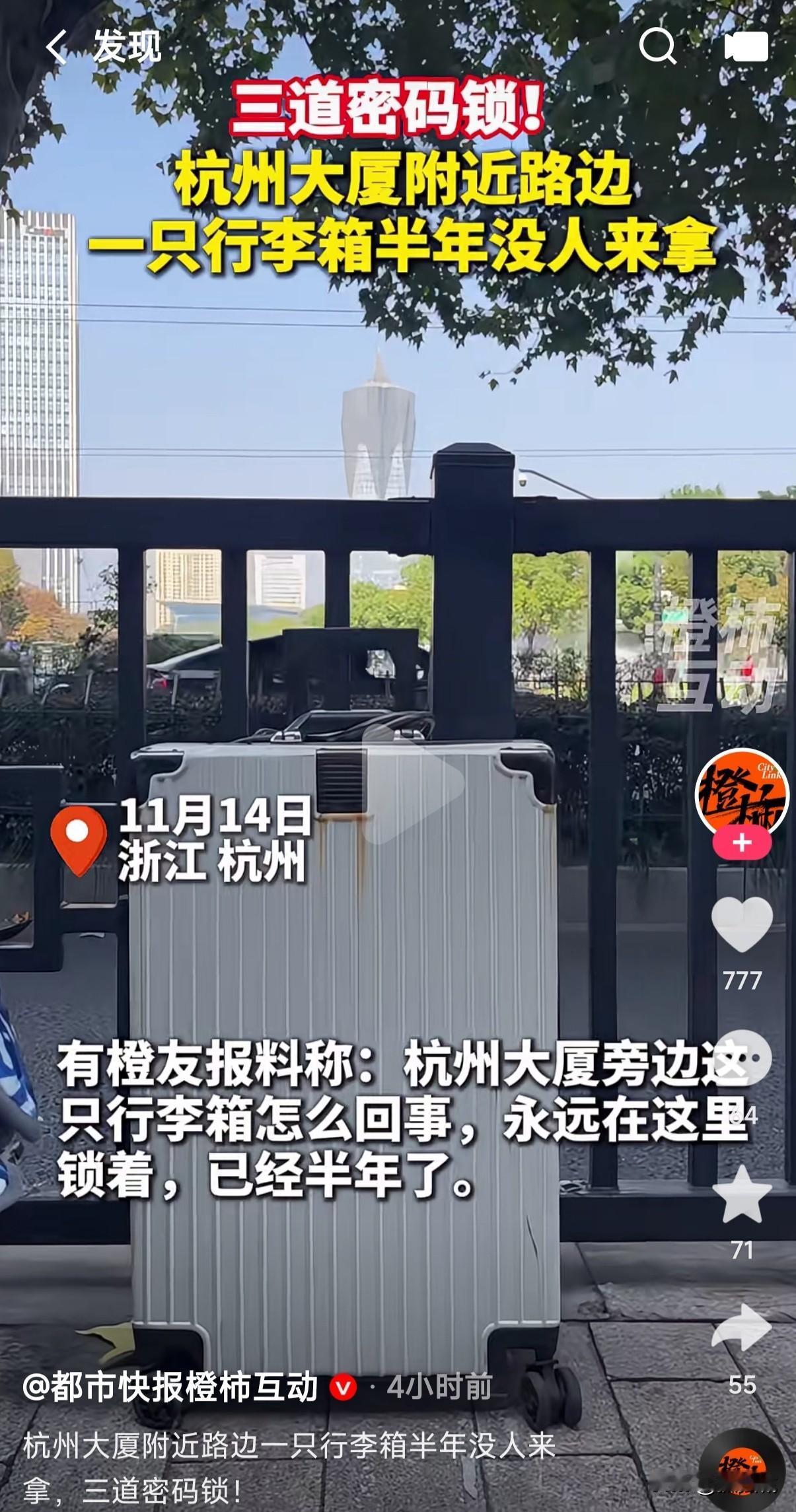 杭州大厦附近路边一只行李箱锁在路边的栏杆上,并且锁三道密码锁,半年多无人去拿,这到底是怎么回事呢? 行李箱锁在路边的栏杆上半年多了无人去拿,这到底是有人锁在哪里给忘拿了?还是故意锁在那里存放的? 不得不说现如今人的素质也好了,这要是搁在以前是不是早被人给偷走了,不知这么大的行李箱里面到底装的是什么?锁在路边半年多竟然没人去拿,而且还锁了三道密码锁,到底是行李箱的主人锁在那里忘记拿了?还是它的主人早已不在了?