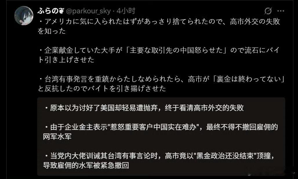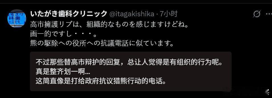 日本网友怀疑高市早苗有水军支持。1450在增援都有可能。去看了几眼,套路确实和1450黑熊学院一模一样。