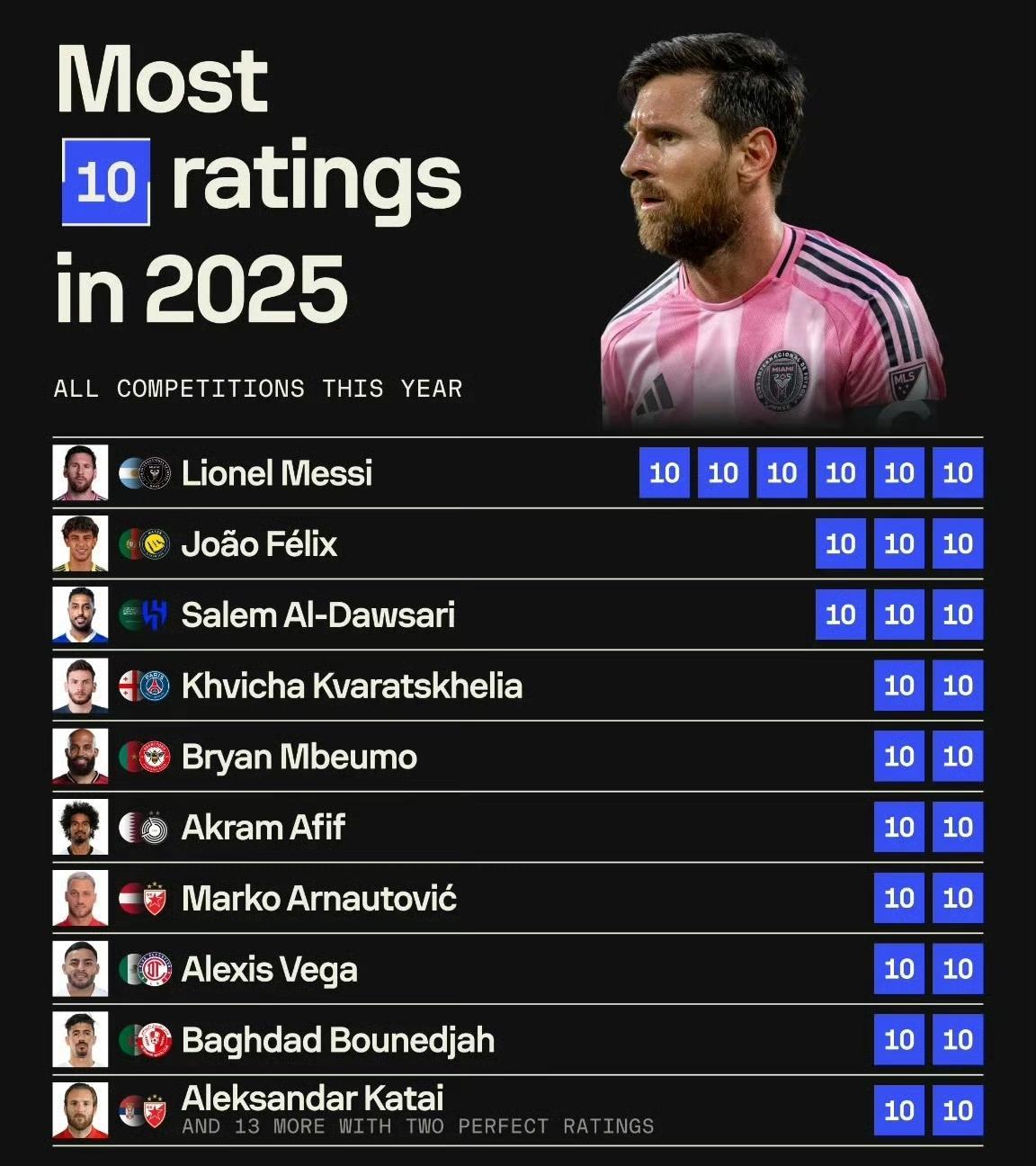 Sofascore发布了今年迄今为止球员们的10分场次榜单。 第一名:梅西,6次,C罗的天敌。他的表现无须多言。 第二名:菲利克斯,3次,C罗在国家队和俱乐部的双重大哥。下半年进球如麻,多次帽子戏法,沙特联赛射手榜头名,有望带着C罗拿到联赛冠军。 第三名:达萨瓦里,3次,利雅得新月队长,C罗在沙特的天敌。去年带队勇夺联赛冠军、国王杯冠军、超级杯冠军。今年荣膺亚冠最佳射手,压住了C罗。他曾在世界杯首战进球,击败阿根廷,收获六亿骡子骡孙,一时间骡粉狂喊:你买nmd阿根廷。
