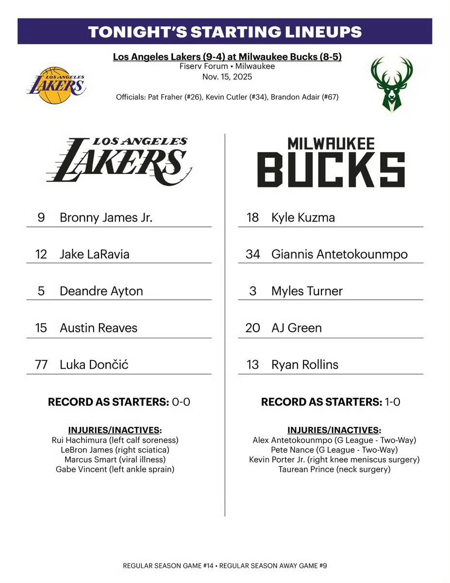 雷迪克不错哟!布朗尼进入首发名单!湖人今日首发:东契奇,里夫斯,布朗尼,拉拉维亚