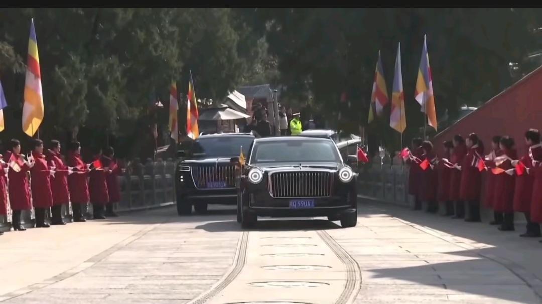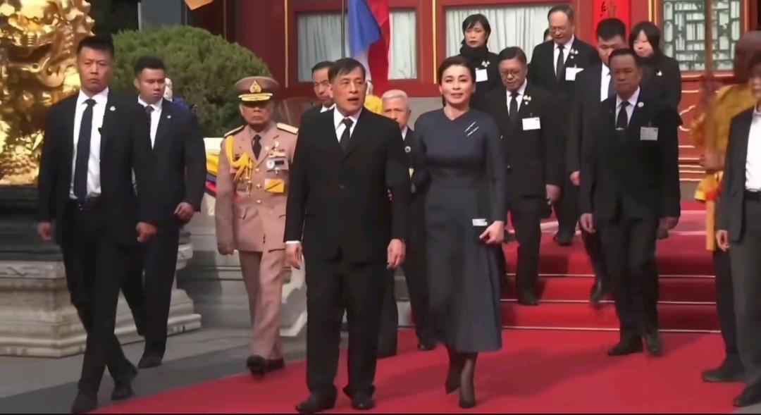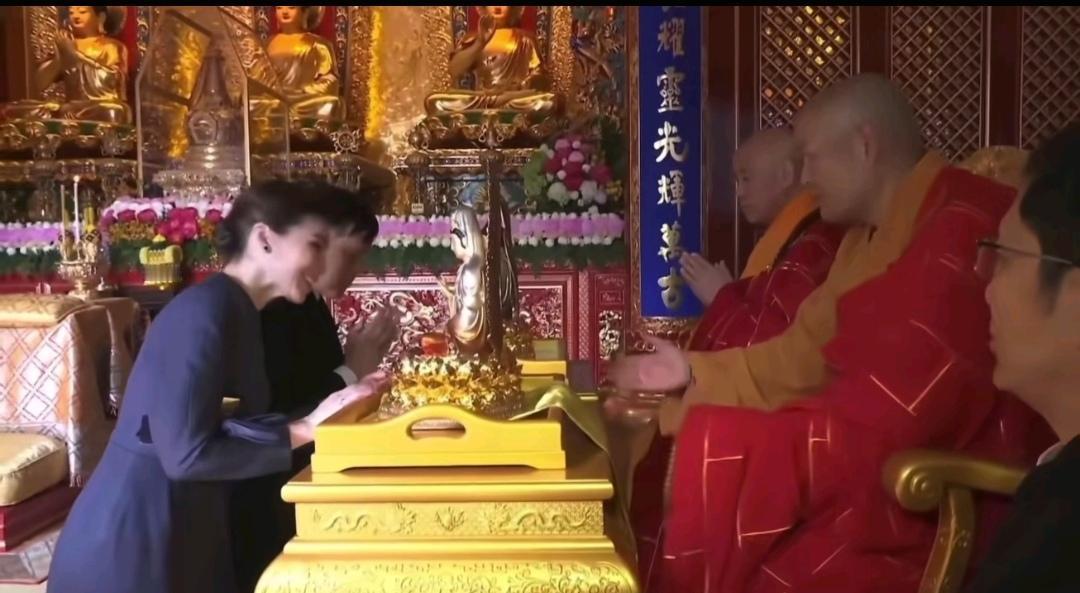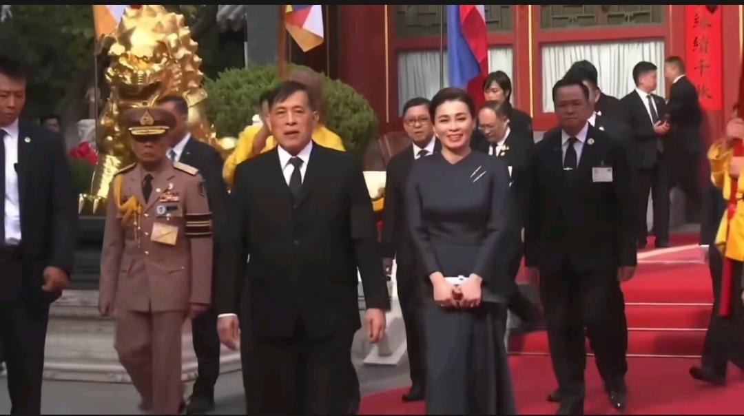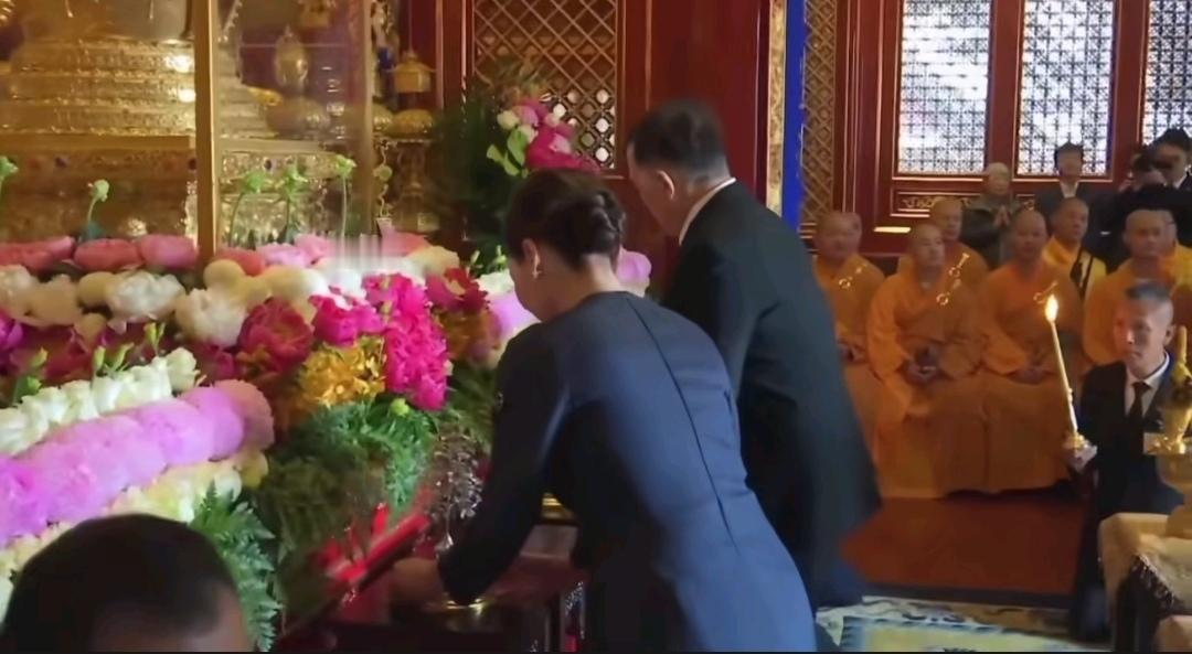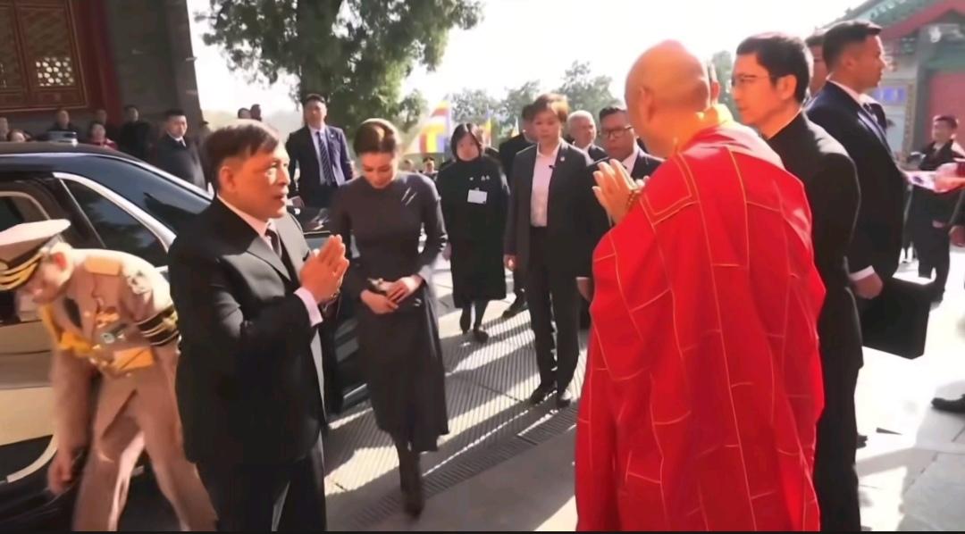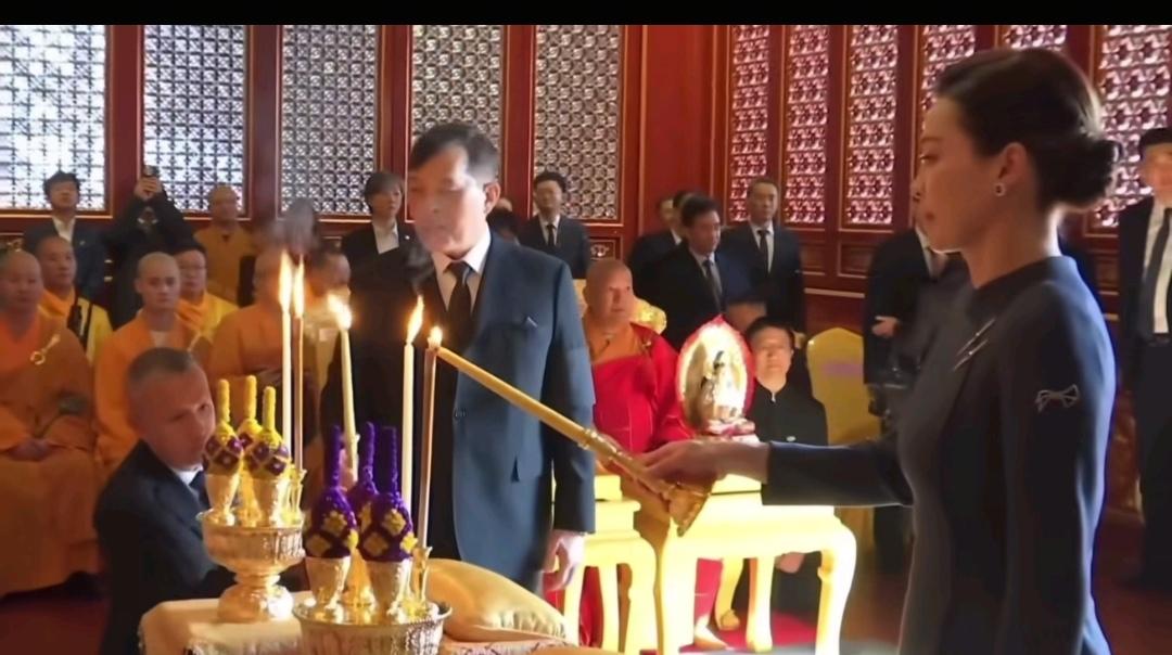 泰王和王后苏提达去敬献佛牙舍利了,车队抵达北京灵光寺,受到夹道欢迎,大家穿着红色棉衣等待泰王和苏提达的到来。 玛哈看到寺院住持,立马双手合十相迎,苏提达跟在身后露出微笑。苏提达穿着一身黑色泰装连衣裙,在敬献佛牙舍利时双手合十。在点燃香后,玛哈和苏提达很虔诚的跪拜。 苏提达看到一座小佛像,很欣喜,前后打量着,抚摸着佛像,然后参观了灵光寺,然后走红毯离开。 阿努廷也去参观了,跟着泰王和苏提达,默默的陪同参加各种活动。