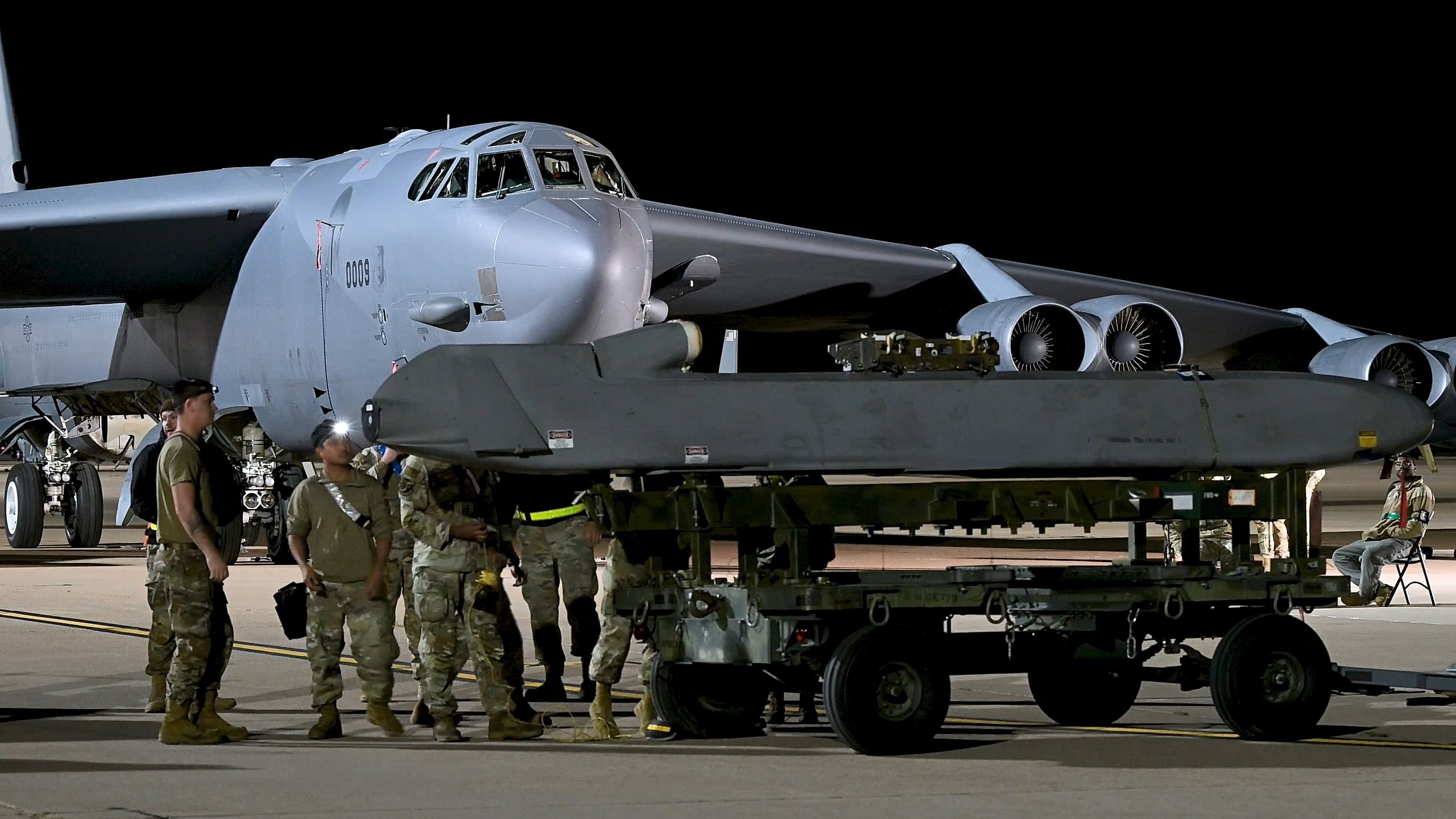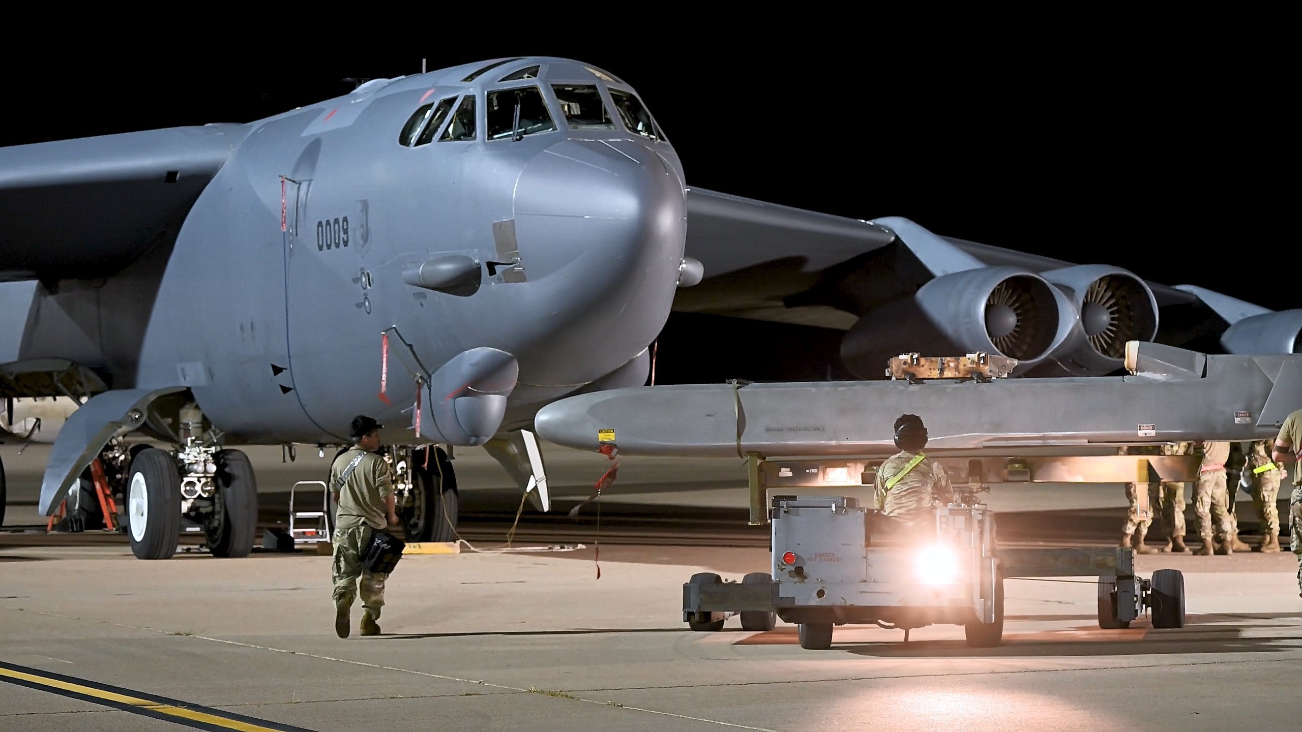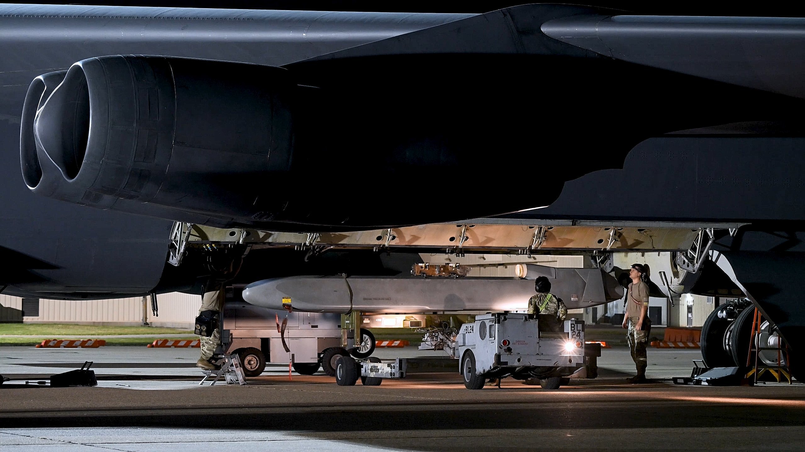 2025年10月28日,“环球雷霆 26”战略核力量演习中,隶属于美国空军全球打击司令部的地勤使用MHU-83D/E航空弹药叉车运输AGM-86的地面训练版,装填到一架位于德克萨斯州戴斯空军基地(DyessAFB)的B-52H“同温层堡垒”战略轰炸机的内置武器舱。摄影:Jade M. Caldwell
