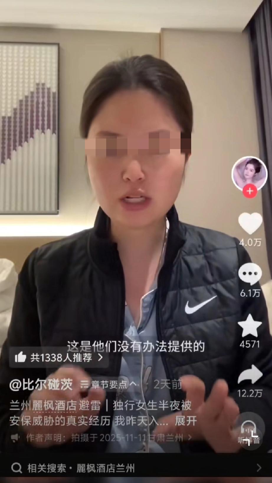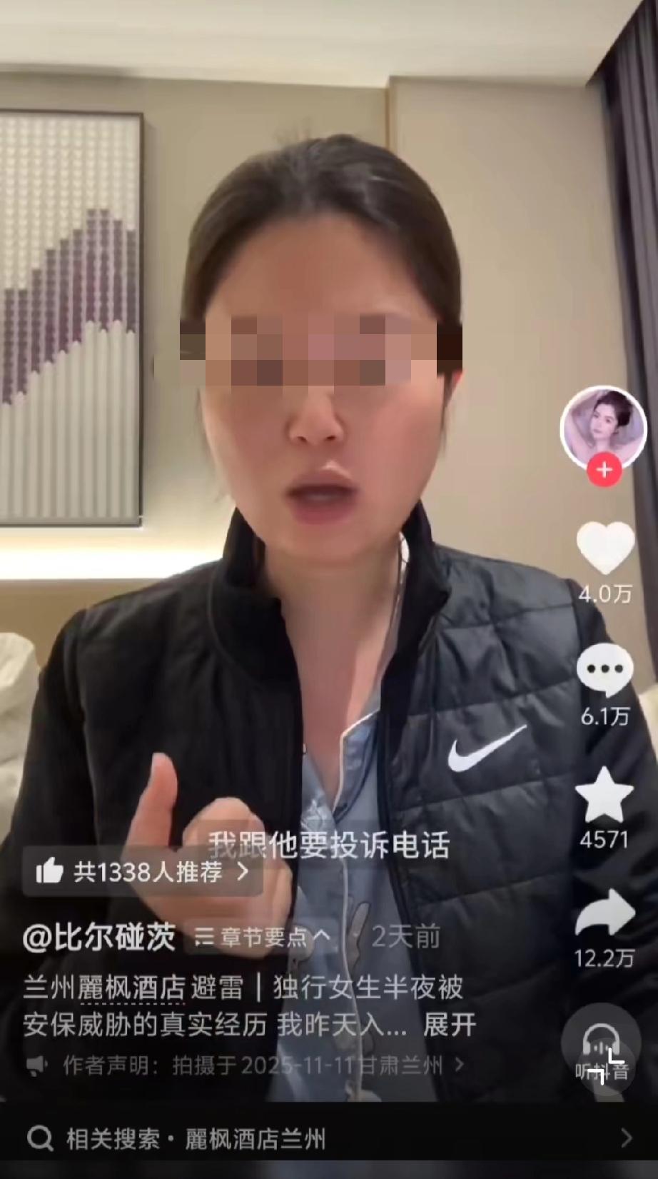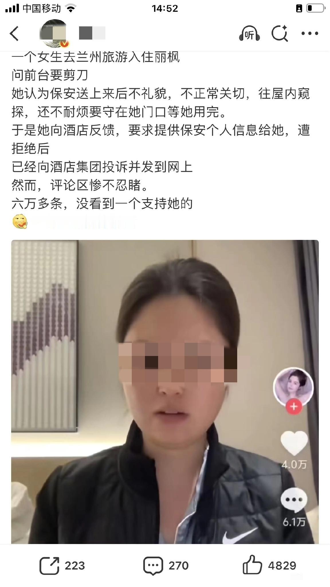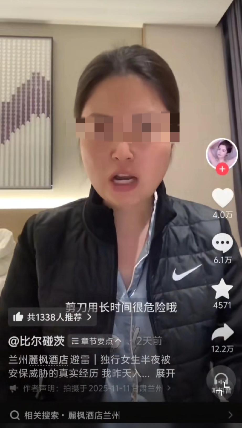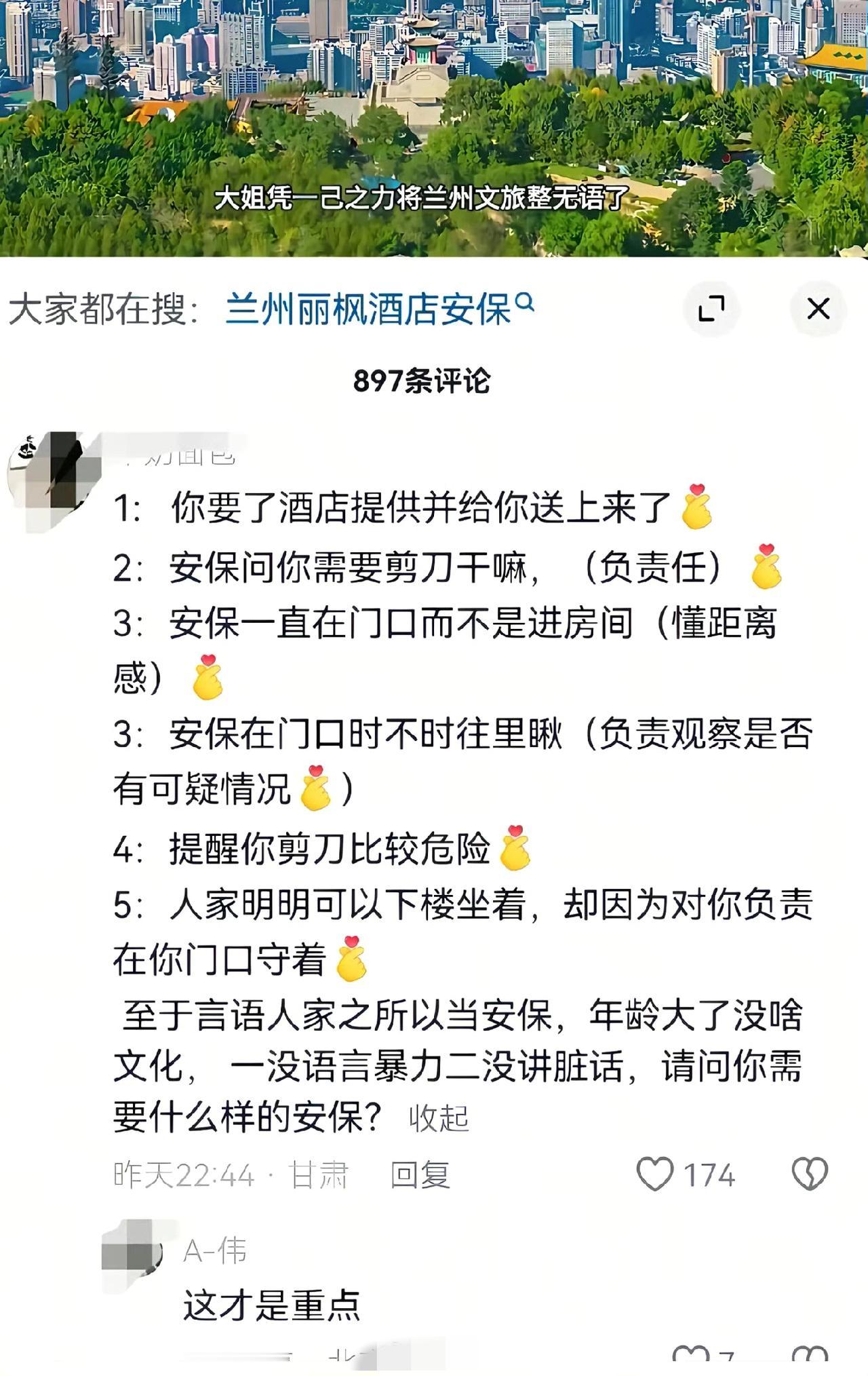唉(╥ω╥`) 这女老师真的把“无理取闹”演绎到极致了, 看着气不打一处来! 大半夜十点多自己主动给酒店打电话借剪刀,保安按规矩送上门,问问用途、站在门口等回收(怕剪刀这利器出意外,酒店行业都是这规矩),还提醒了句“用久了危险”,这明明是尽职尽责的贴心操作,结果到她那就成了“窥探房间、威胁她”? 更离谱的是,她转头就拍视频发网上煽动舆论,把自己塑造成受害者,还要求酒店给保安个人信息,被拒后又连环投诉。结果网友全看明白了——这不是没事找事吗? 保安守在门口是怕她出事,提醒危险是关心,全程没一点越界的地方,评论区六万多条留言没一个帮她的,全在夸保安负责,甚至有人喊着要给保安颁锦旗。 最讽刺的是她还是个老师,本该教书育人、明辨是非,结果反而颠倒黑白、栽赃陷害,难怪网友吐槽“刻板印象又增加了”。 兰州文旅都被这操作整无奈了,就发了个“唉”字,直接收获五万个赞,这一个字道尽了多少无语啊! 丽枫酒店也是倒了八辈子霉,摊上这么个矫情又不讲理的客人,保安按规程做事没做错任何事,最后还得陪着道歉。真的求求这种人别滥用舆论维权了,把好好的规则当空气,把别人的尽职尽责当“冒犯”,纯属给社会添乱!