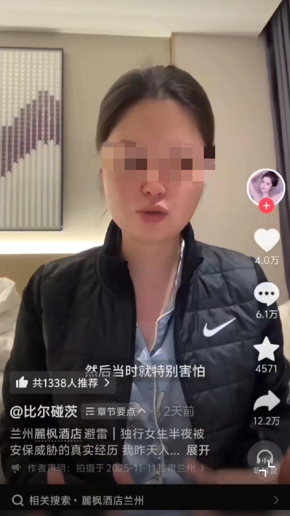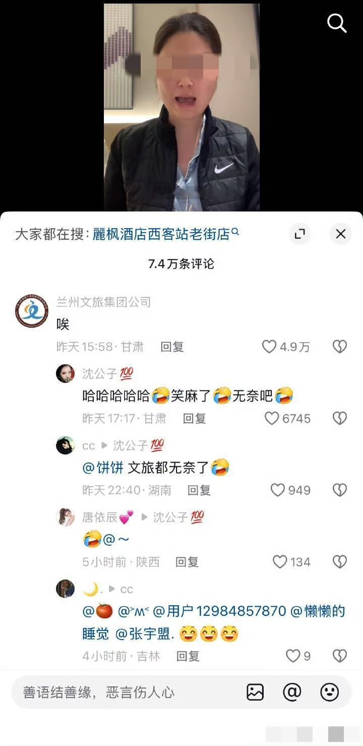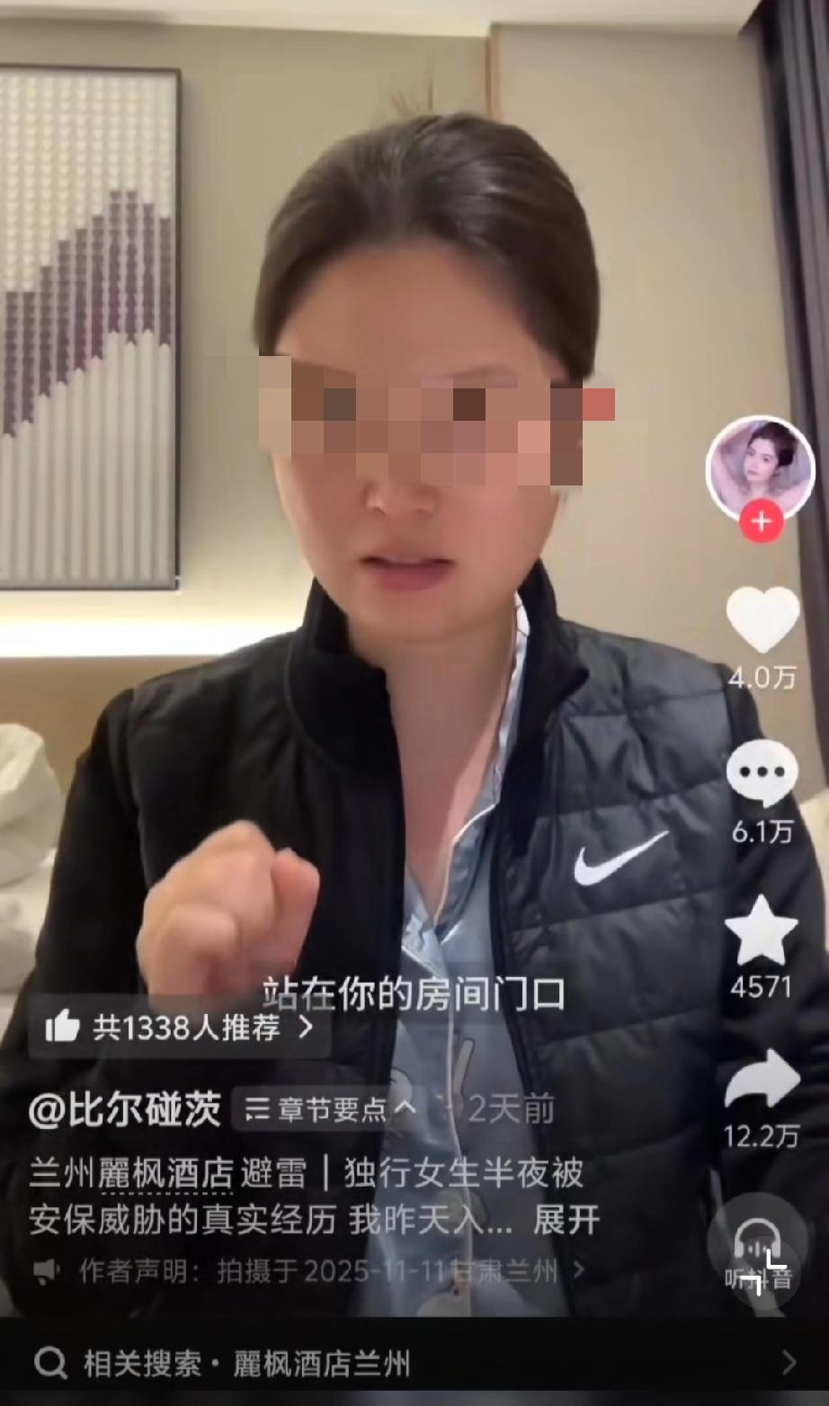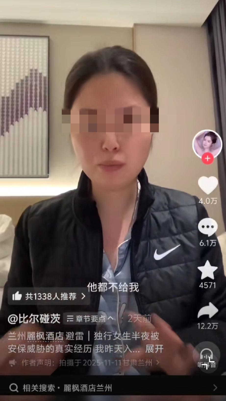 唉(╥ω╥`) 这女老师真的把“无理取闹”演绎到极致了, 看着气不打一处来! 大半夜十点多自己主动给酒店打电话借剪刀,保安按规矩送上门,问问用途、站在门口等回收(怕剪刀这利器出意外,酒店行业都是这规矩),还提醒了句“用久了危险”,这明明是尽职尽责的贴心操作,结果到她那就成了“窥探房间、威胁她”? 更离谱的是,她转头就拍视频发网上煽动舆论,把自己塑造成受害者,还要求酒店给保安个人信息,被拒后又连环投诉。结果网友全看明白了——这不是没事找事吗? 保安守在门口是怕她出事,提醒危险是关心,全程没一点越界的地方,评论区六万多条留言没一个帮她的,全在夸保安负责,甚至有人喊着要给保安颁锦旗。 最讽刺的是她还是个老师,本该教书育人、明辨是非,结果反而颠倒黑白、栽赃陷害,难怪网友吐槽“刻板印象又增加了”。 兰州文旅都被这操作整无奈了,就发了个“唉”字,直接收获五万个赞,这一个字道尽了多少无语啊! 丽枫酒店也是倒了八辈子霉,摊上这么个矫情又不讲理的客人,保安按规程做事没做错任何事,最后还得陪着道歉。真的求求这种人别滥用舆论维权了,把好好的规则当空气,把别人的尽职尽责当“冒犯”,纯属给社会添乱!