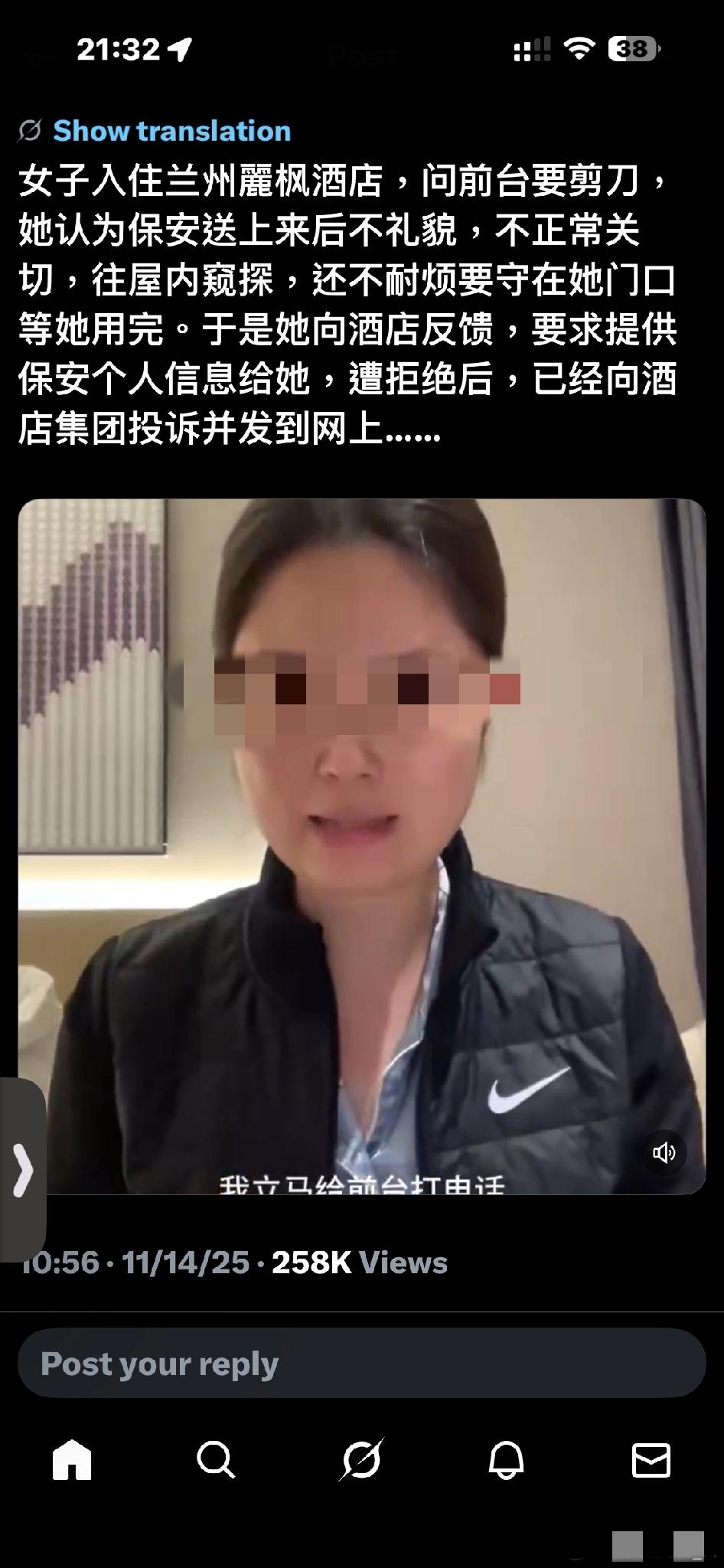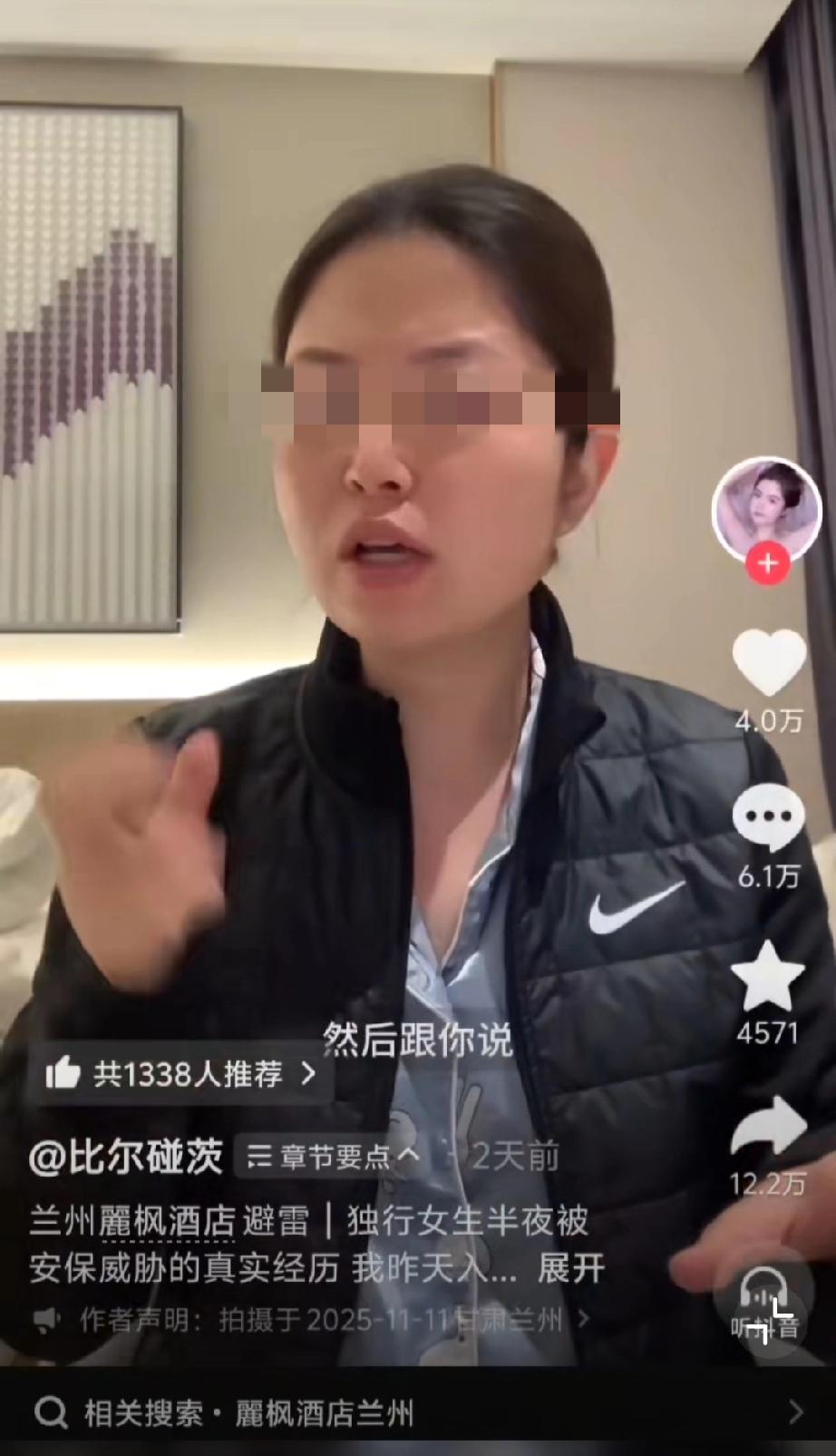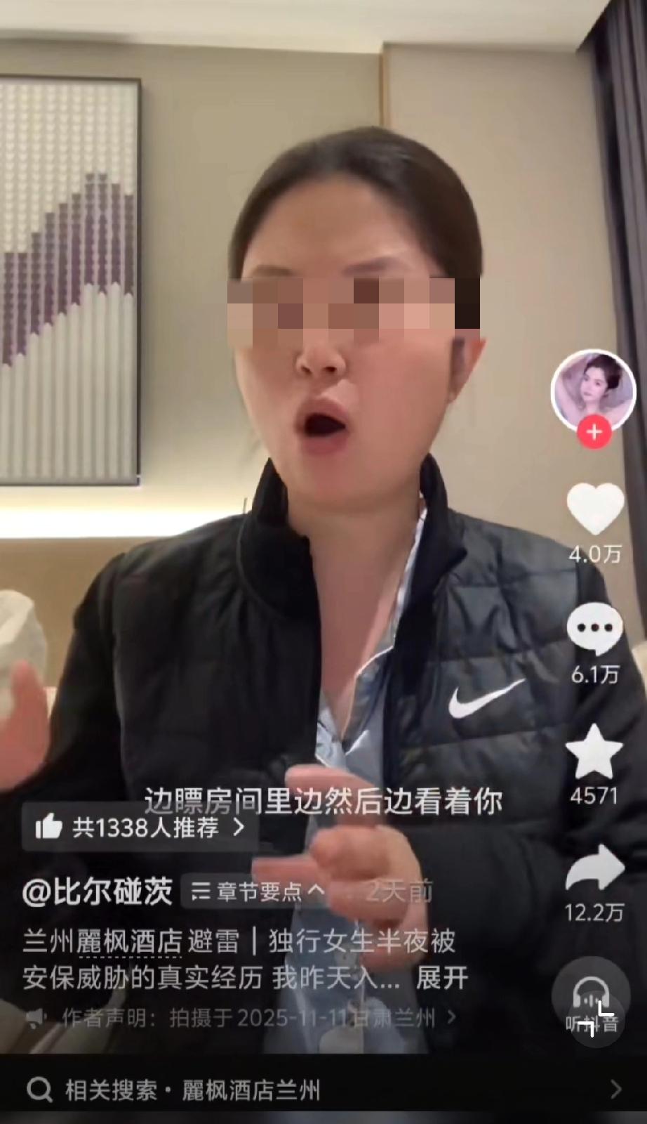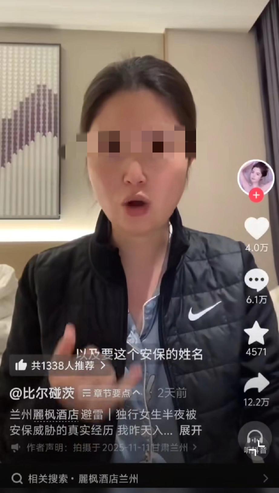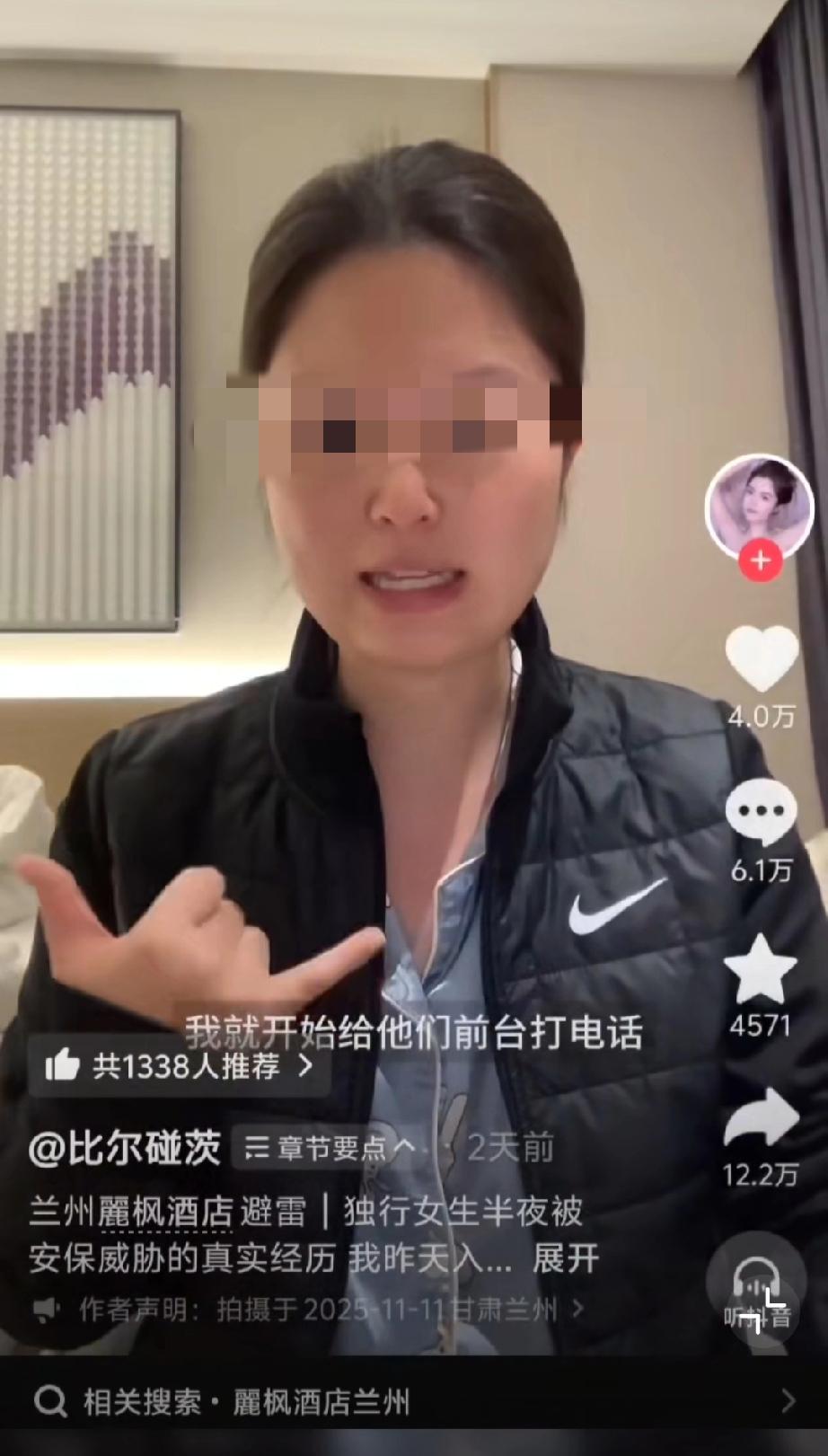 唉(╥ω╥`) 这女老师真的把“无理取闹”演绎到极致了, 看着气不打一处来! 大半夜十点多自己主动给酒店打电话借剪刀,保安按规矩送上门,问问用途、站在门口等回收(怕剪刀这利器出意外,酒店行业都是这规矩),还提醒了句“用久了危险”,这明明是尽职尽责的贴心操作,结果到她那就成了“窥探房间、威胁她”? 更离谱的是,她转头就拍视频发网上煽动舆论,把自己塑造成受害者,还要求酒店给保安个人信息,被拒后又连环投诉。结果网友全看明白了——这不是没事找事吗? 保安守在门口是怕她出事,提醒危险是关心,全程没一点越界的地方,评论区六万多条留言没一个帮她的,全在夸保安负责,甚至有人喊着要给保安颁锦旗。 最讽刺的是她还是个老师,本该教书育人、明辨是非,结果反而颠倒黑白、栽赃陷害,难怪网友吐槽“刻板印象又增加了”。 兰州文旅都被这操作整无奈了,就发了个“唉”字,直接收获五万个赞,这一个字道尽了多少无语啊! 丽枫酒店也是倒了八辈子霉,摊上这么个矫情又不讲理的客人,保安按规程做事没做错任何事,最后还得陪着道歉。真的求求这种人别滥用舆论维权了,把好好的规则当空气,把别人的尽职尽责当“冒犯”,纯属给社会添乱!