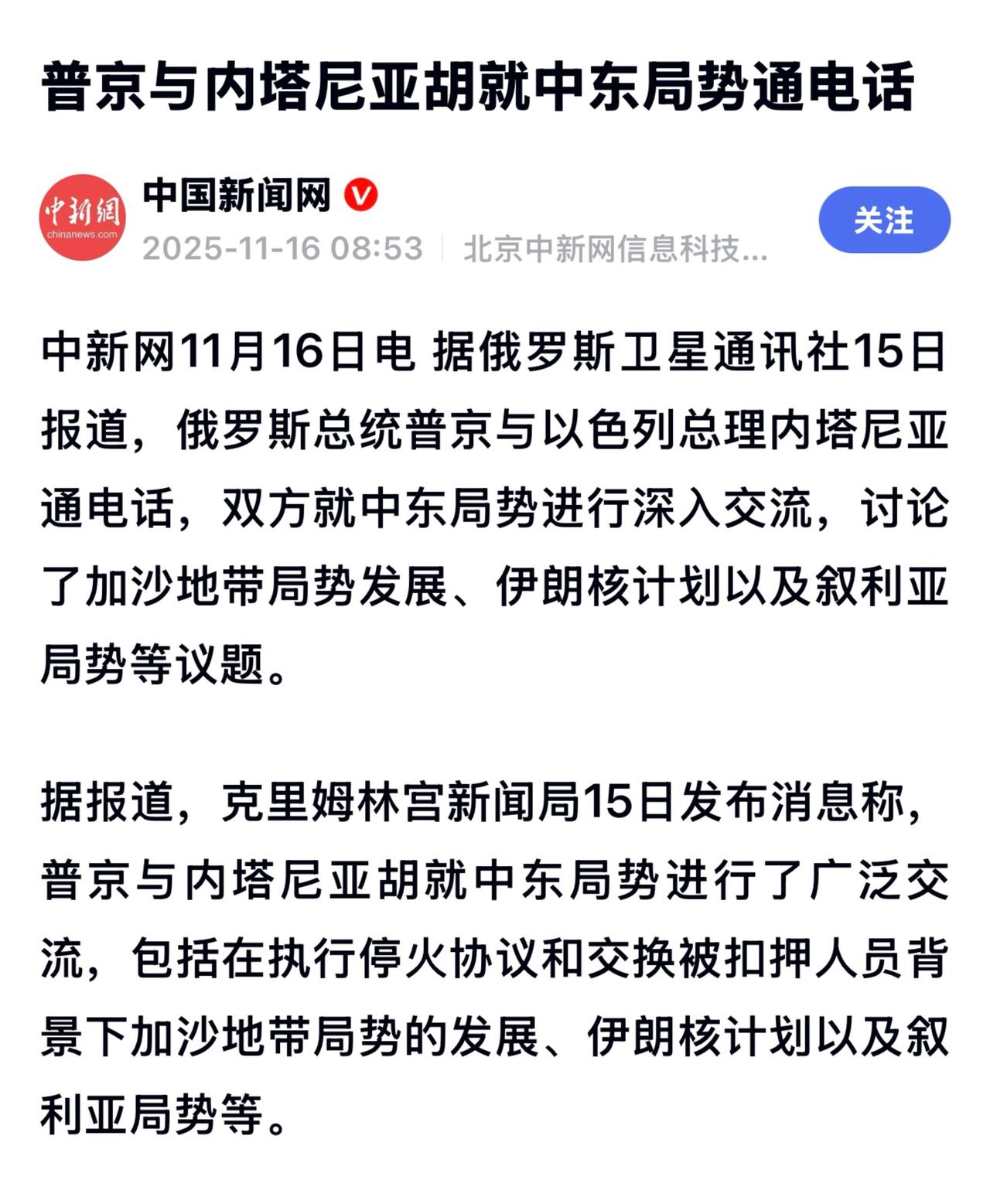 以色列通报说这次通话由普京主动发起 以总理办公室表示,这是双方近期一系列通话中的最新一次,通话涉及地区问题。 俄以领导人此前曾数次通话。普京在10月中旬的通话中强调应和平解决加沙问题,并称莫斯科希望协助阻止加沙地区爆发人道主义灾难。 以方的新闻稿则说,内坦亚胡向普京表表明,在哈马斯被摧毁之前,以色列不会停止对加沙的攻势。