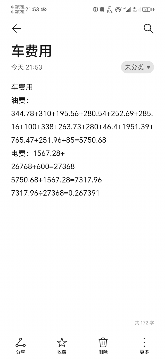 秦dmi分享一年油耗 买车326天了,秦dmi55公里版本续航,跑了26768公里,总共加油5750.68元,充电费用是1567.28元(在外面充电电费是1-1.8元之间一度电费),现在还剩余700公里(安600 公里算),26768+600=27368公里,油费加电费总共费用是5750.68+1567.28=7317.96元,7317.96÷27368=0.267391元(平均每公里2毛6)