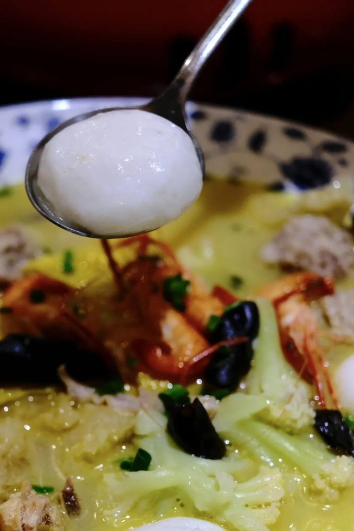 绍三鲜类似杭三鲜,拿包头鱼鱼身做的鱼圆,不掺一点面粉,全靠师傅手工打浆打出来。