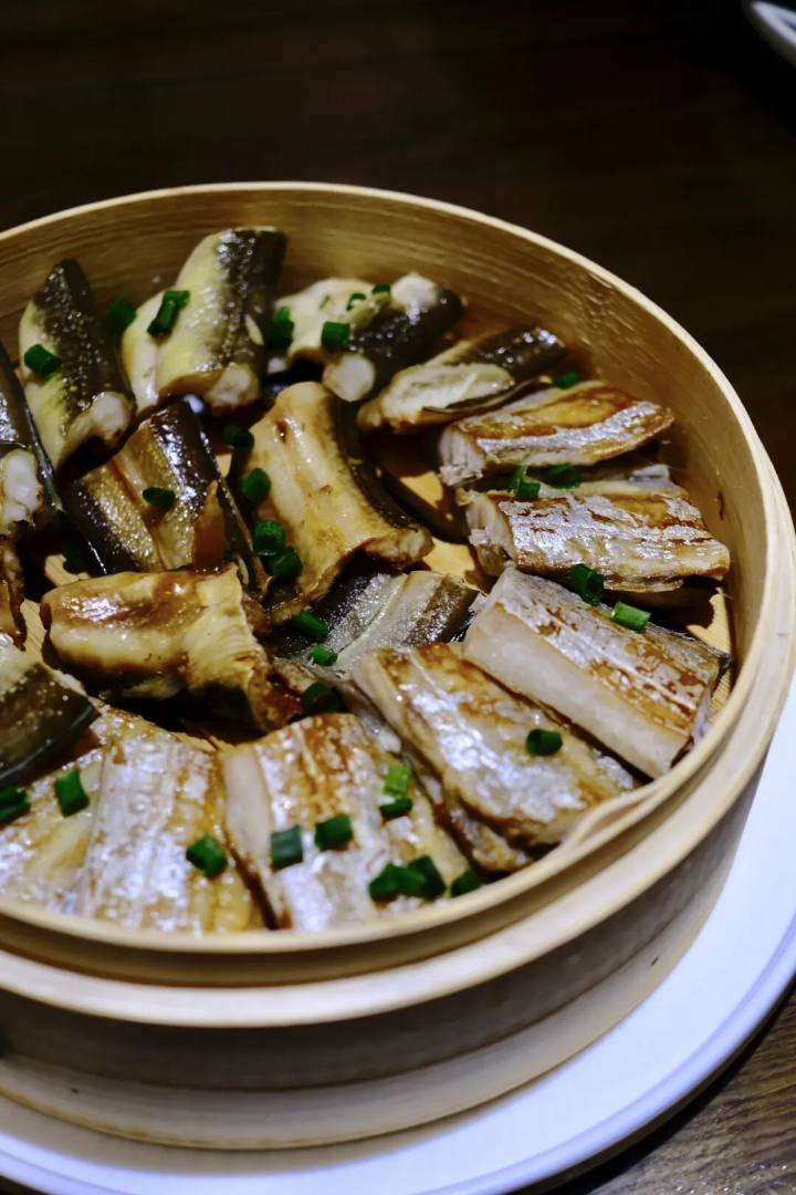 陈年火腿蒸花雕小野鸭,上桌先闻一阵花雕酒香,神魂已勾去三魄。用的三年火腿恰好,五年就有齁味了。所谓野鸭乃水库里养的水鸭,但品种是野鸭品种。