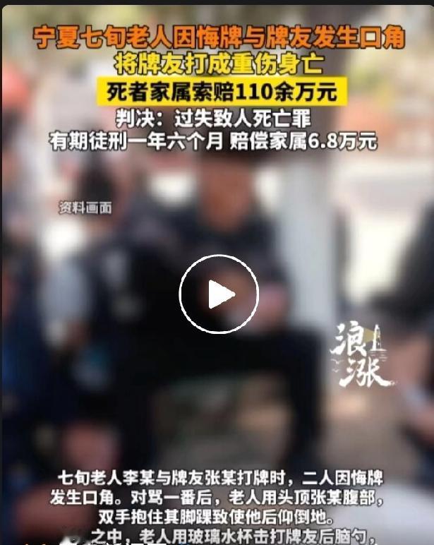 老头打牌吵架打死人,赔了6万8。 在宁夏,一群70多岁的老人打牌,因为悔牌的事情,李老头就用头去撞击张老头的肚子,然后抓住张老头的脚把他打翻在地。张老头起身后打了李老头一下,然后转身想跑,李老头拿起水杯追上去砸在张老头头上,张老头鲜血直流。 张老头立即报警并走出打牌的棋牌室,但走出门口就晕倒了。 送到医院后,医院下了病危通知书,张老头的家属放弃了治疗,把张老头拉回了家,当晚8点张老头去世。 经司法鉴定,张老头脑子里有动脉瘤,被李老头打了之后破裂了。 张老头的家属要李老头赔110万元,在宁夏,这算是一笔巨款了吧。李老头没赔。 由于死者家属没有出具谅解书,法院判决李老头1年6个月的实刑,另外赔偿6万8千元。 哎,70多岁的老头了,脾气还这么大,估计在家里也是这样。李老头要是出了问题,不知道他们家是不是也是会放弃治疗。 殴打古稀老人 广东老人被打 打麻将中风