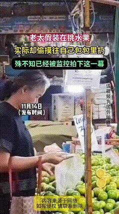 惊呆了家人们!瞅瞅这位大妈,乍一看在挑水果,凑近一瞧,猫腻可大了!她往塑料袋装水果的时候,手还偷偷往兜里塞,动作那叫一个快,藏得那叫一个隐蔽,感觉都成习惯了。 大妈还以为神不知鬼不觉呢,可监控把一切都照得明明白白。这下好了,她这丑态全暴露了,儿女脸上估计也挂不住,以后出门,街坊邻居不得戳她脊梁骨啊。 就为了这点水果贪小便宜,值当吗?人活一张脸,树活一张皮,素质低下,福气都得被自己赶走咯。大家身边要是碰到这种事儿,会怎么想呢?大妈偷摘水果