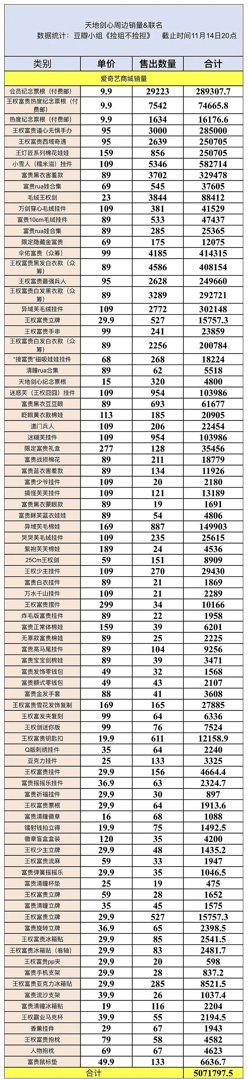《天地剑心》周边销量(不含联名)仅爱奇艺商城已售507w+,暂列2025年第二,
