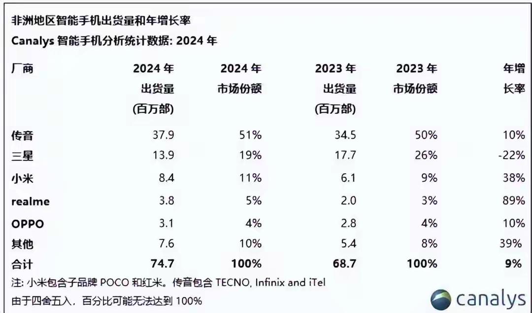 非洲手机市场新变化,三星手机市场份额继续下跌,传音依然还是稳坐头把交椅! 传音,非洲人最喜欢用的手机。当初传音在非洲闯出一条专属赛道,拍照自带美白功能,手机多卡多带(比双卡还多)。传音在其他手机厂商抓欧洲、亚洲、美洲市场的时候,反其道而行之,深耕非洲市场。 第三名是小米,然后是realme和OPPO,都是中国的手机品牌。我们鼓励中国企业出海。以前大家觉得非洲市场太小,但再小的市场也能有大收获。传音手机就是最佳榜样!