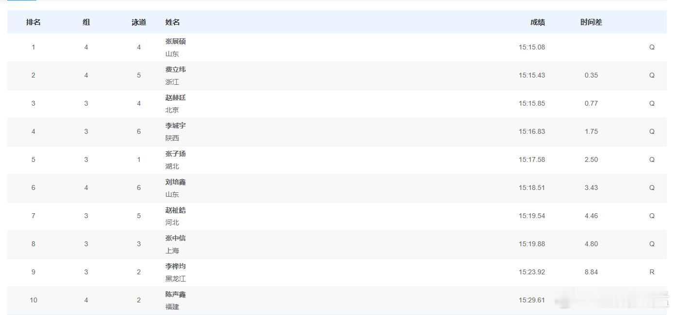 全运男1500自预赛张展硕小胜费立纬排名第一 明晚决赛或加冕五冠王11月16日上午,全运游泳大项结束了男子1500米自由泳预赛,已经拿下四冠的山东选手张展硕,以15分15秒08排名预赛第一。张展硕和最强对手、浙江选手费立纬同组。从本届全运会前面的比赛来看,张展硕如今的实力,已经脱离以往定位,国内赛事不存在五五开的对手。1500自是费立纬最后的争冠和证明机会。本场预赛张展硕和费立纬长时间齐头并进。到了最后100米,张展硕略微加速确立些许优势,他以15分15秒08排名第一,费立纬15分15秒43排名第二。两人也是预赛总第一和第二位。北京队赵赫廷15分15秒85列预赛第三。决赛将在明晚19点21分进行。