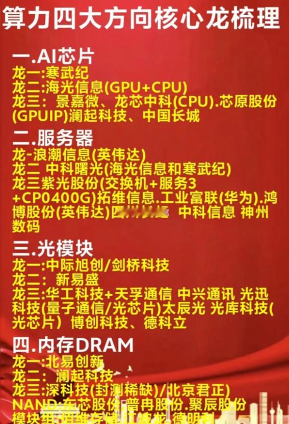 算力产业四大核心方向与领军企业概览在人工智能浪潮推动下,算力产业已成为数字经济的核心基础,主要围绕以下四大方向展开:1.AI芯片算力的“大脑”,承担模型训练与推理任务。技术壁垒高,国内外企业积极布局,创新活跃,国产替代潜力显著。2.服务器算力输出的物理载体。随着数据量与云业务增长,市场需求持续提升,行业向高效能、低功耗方向迭代。3.光模块数据传输的“神经枢纽”。在高速率需求驱动下,技术快速升级,800G等高端产品逐步放量,受益于数据中心与网络建设。3.存储芯片(DRAM)算力架构的关键部分。在服务器与智能终端需求驱动下,技术迭代加速,具备自主能力的企业更具市场优势。整体来看,算力赛道市场情绪积极,政策支持明确,各细分领域协同发展。随着技术持续突破与应用场景拓展,算力基础设施有望长期受益于数字化与智能化进程。以上信息为公开资料整理,仅供参考,不构成投资建议。