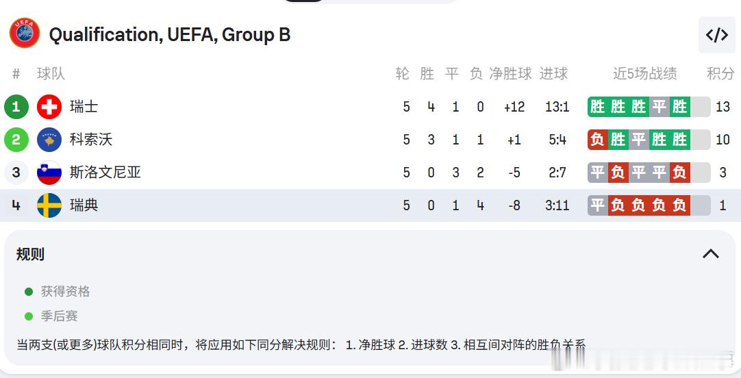 瑞典队在世预赛小组中的战绩👀 • 5场比赛• 0胜• 4负• 1平• 进3球• 丢11球但他们仍可以通过欧国联的成绩获得附加赛资格😅