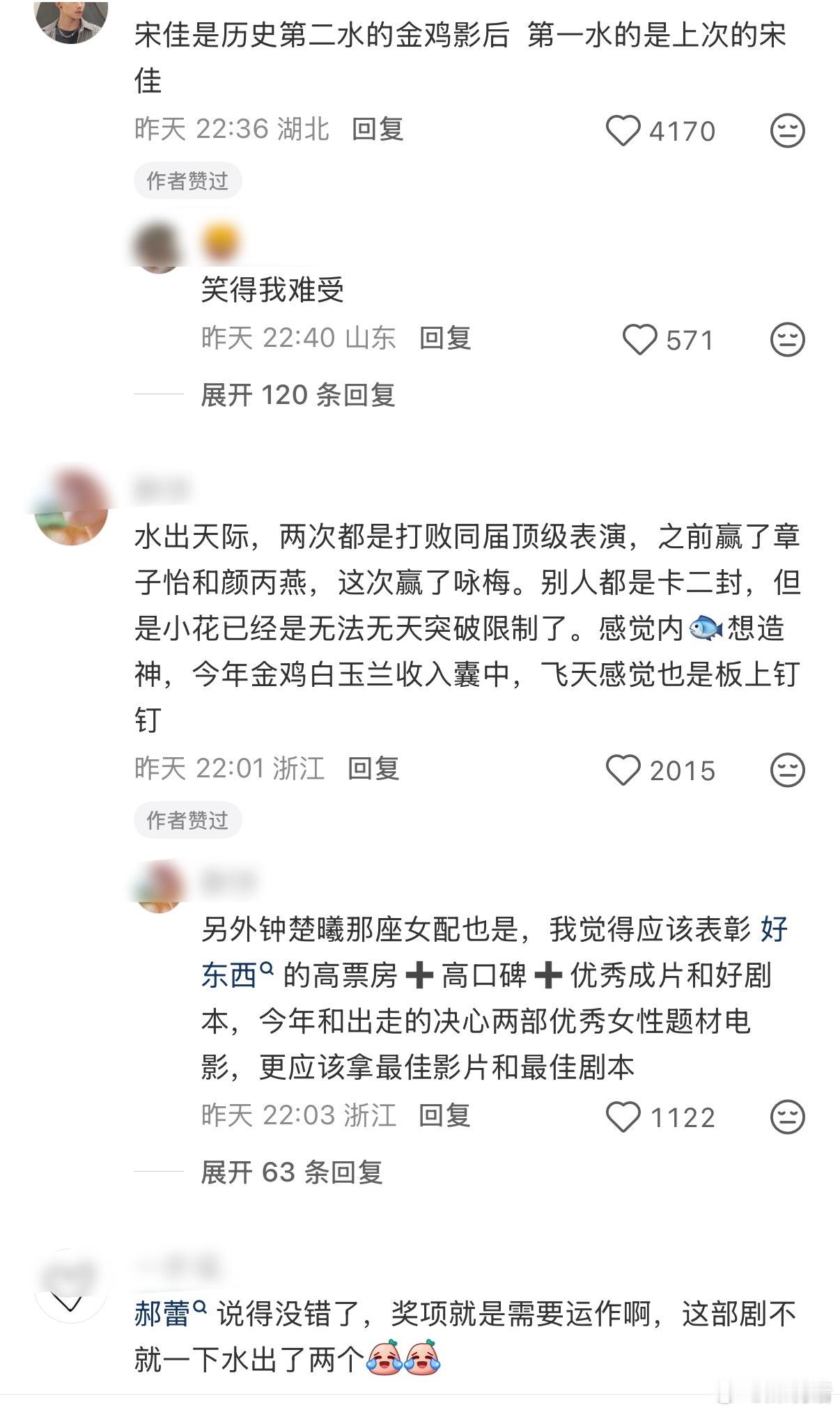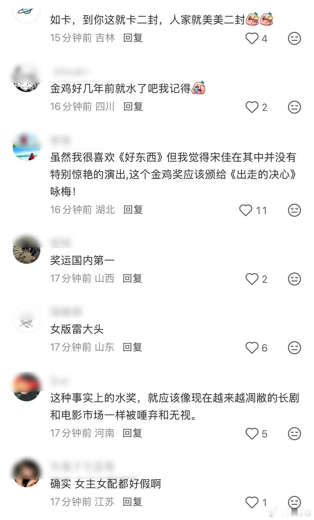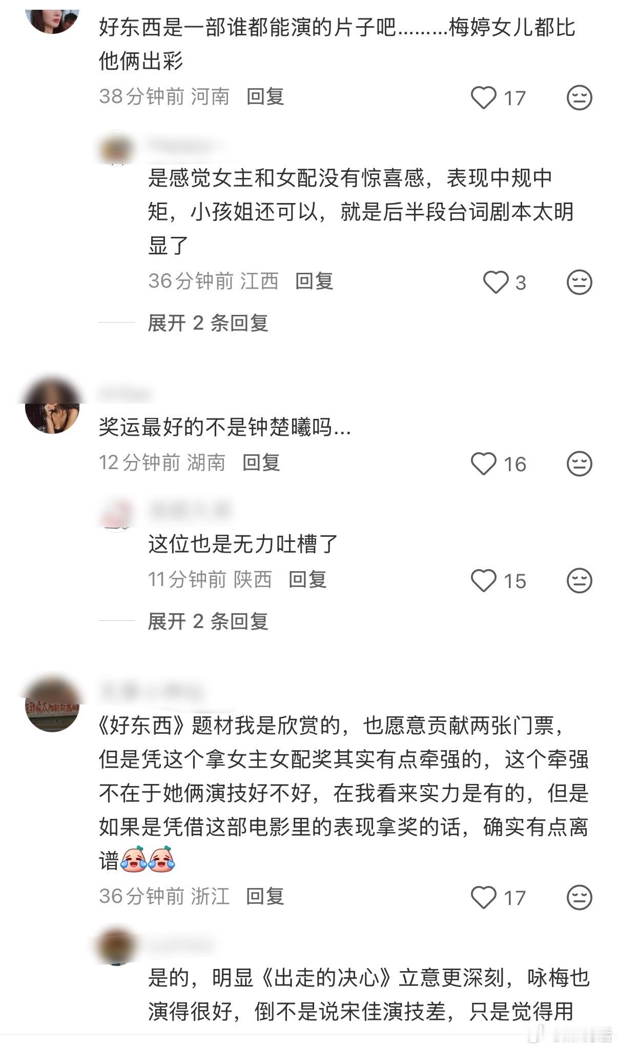 大部分观众认为《好东西》火很多程度上是因为题材和编剧,并没有多少人觉得主演演技有多厉害。整部电影都是生活化演绎,对演技要求并不高,几乎换哪位专业演员都行。但是《好东西》在本届金鸡竟然没有拿下故事、编剧、导演奖,而是同时拿下最佳女主角和女配角,让人意外也催生质疑。尤其是宋佳击败大热的咏梅《分手的决心》、钟楚曦击败惠英红 蒋勤勤,让观众唏嘘。她们的表演虽然好但也没有好到能拿奖而且是同时拿奖的地步。虽然得了奖,却丢了观众缘。已经有很多人为当年颜丙燕二封金鸡失败而惋惜,真是时代不同了……郝蕾的话含金量还在上升