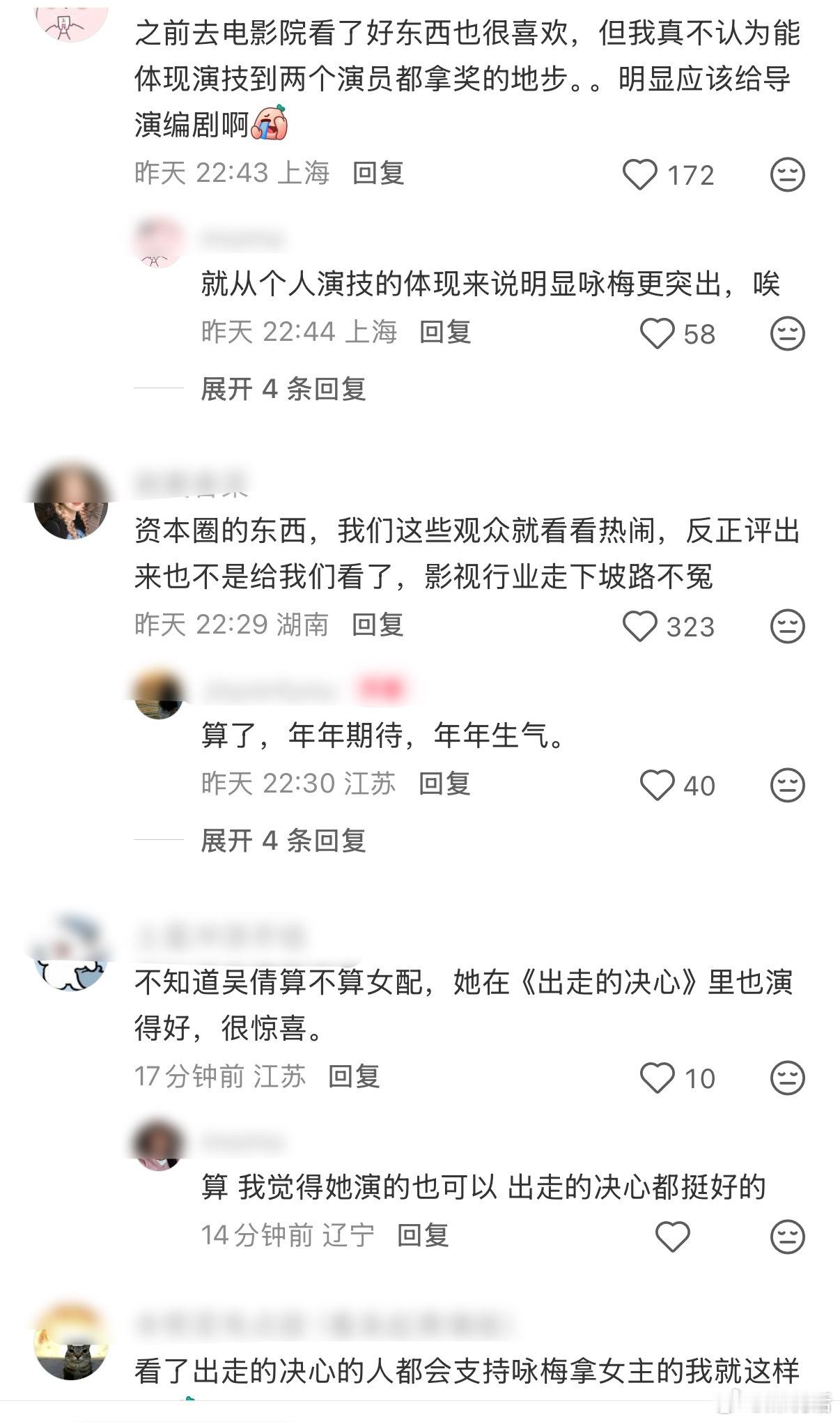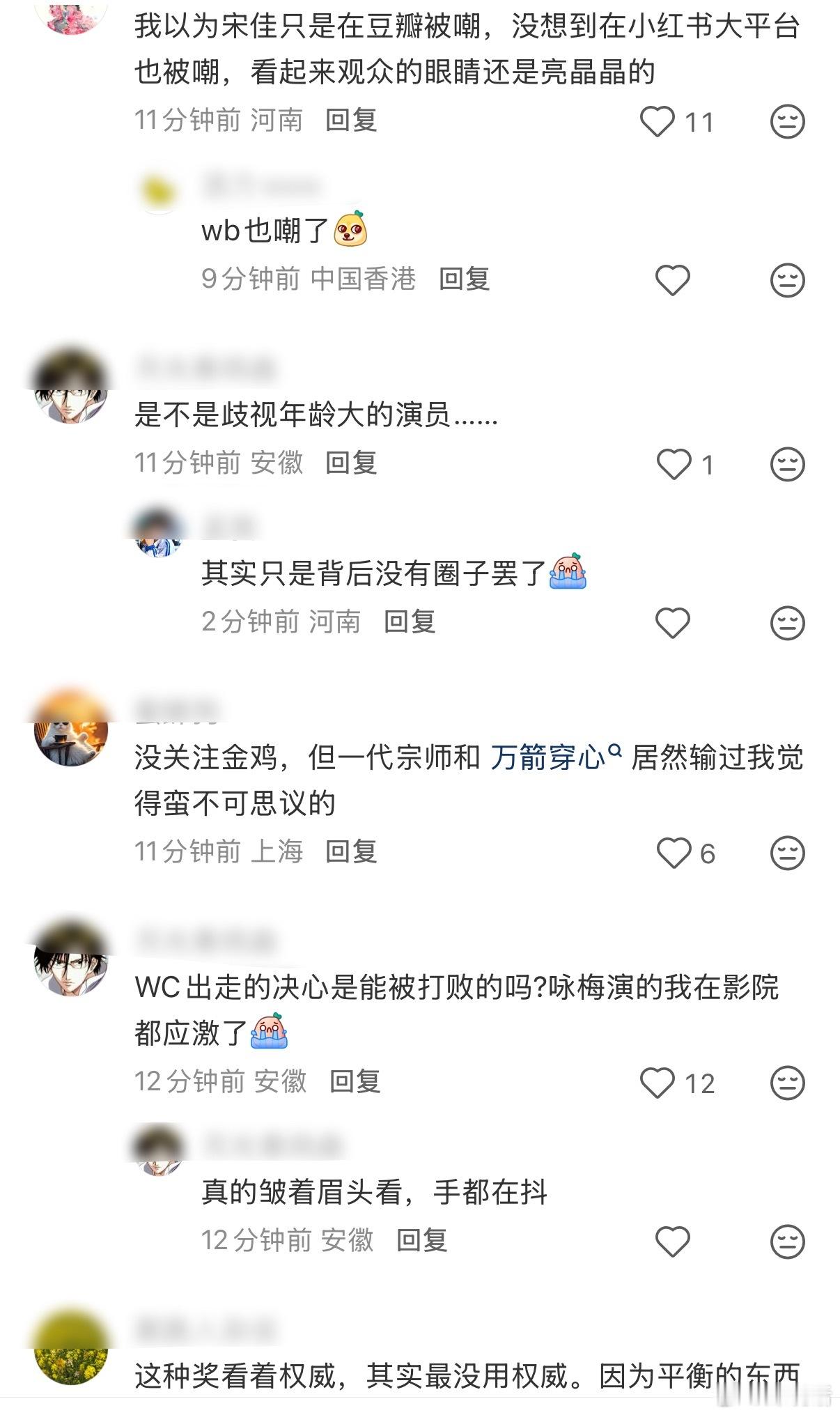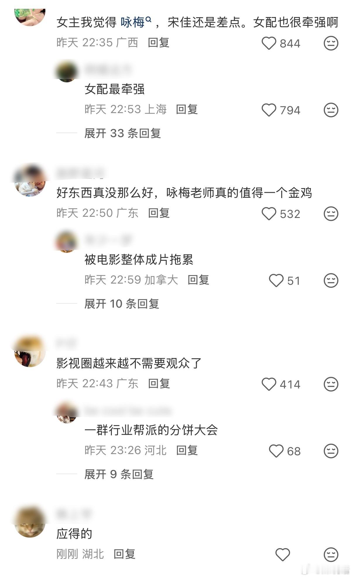 大部分观众认为《好东西》火很多程度上是因为题材和编剧,并没有多少人觉得主演演技有多厉害。整部电影都是生活化演绎,对演技要求并不高,几乎换哪位专业演员都行。但是《好东西》在本届金鸡竟然没有拿下故事、编剧、导演奖,而是同时拿下最佳女主角和女配角,让人意外也催生质疑。尤其是宋佳击败大热的咏梅《分手的决心》、钟楚曦击败惠英红 蒋勤勤,让观众唏嘘。她们的表演虽然好但也没有好到能拿奖而且是同时拿奖的地步。虽然得了奖,却丢了观众缘。已经有很多人为当年颜丙燕二封金鸡失败而惋惜,真是时代不同了……郝蕾的话含金量还在上升