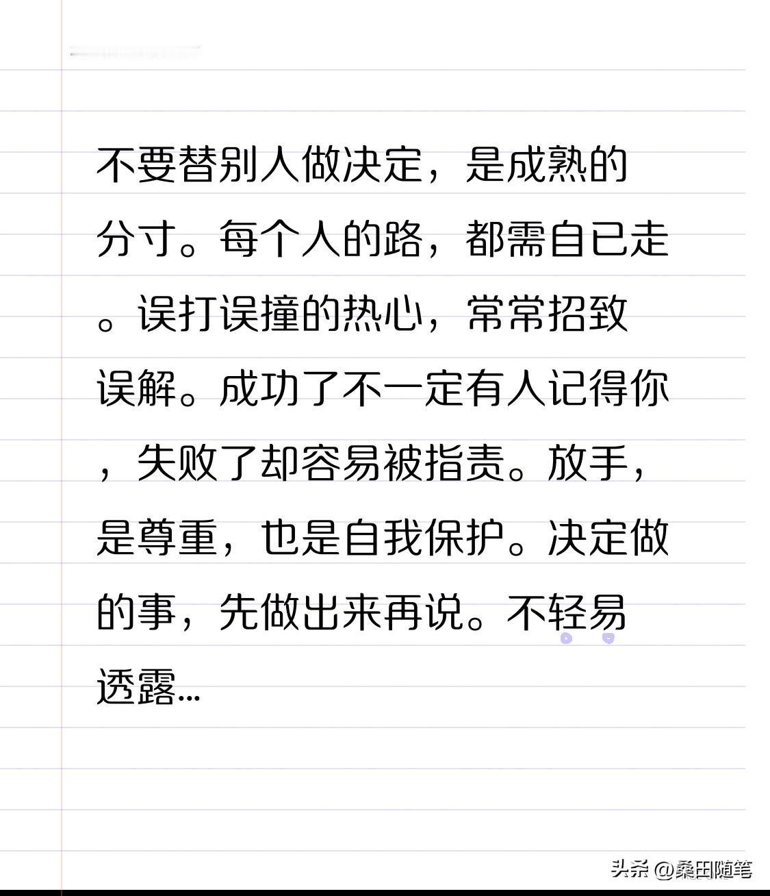 不要替别人做决定,是成熟的分寸。每个人的路,都需自已走。误打误撞的热心,常常招致误解。成功了不一定有人记得你,失败了却容易被指责。放手,是尊重,也是自我保护。 决定做的事,先做出来再说。不轻易透露计划,免去闲言碎语。结果才是最好的解释。闷声做事,闷声发财,让成绩成为声音。 调整负面情绪、少发脾气,才能有更多的好运。温顺的脾气,不是软弱,而是一种力量。善良与克制,是通向幸福的航道。