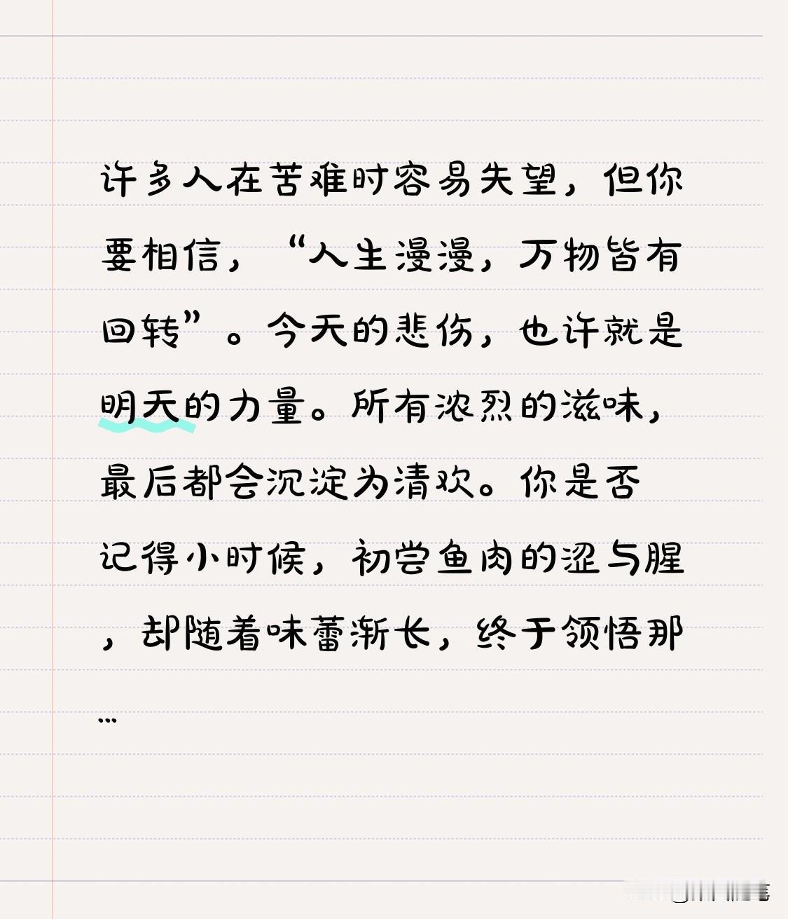 许多人在苦难时容易失望,但你要相信,“人生漫漫,万物皆有回转”。今天的悲伤,也许就是明天的力量。所有浓烈的滋味,最后都会沉淀为清欢。你是否记得小时候,初尝鱼肉的涩与腥,却随着味蕾渐长,终于领悟那一缕鲜香?人生亦是如此。经历是积累坚韧不拔的向上力量。 在困境中,不失向光而行的信念;在曲折处,吸取温柔自省的底蕴;在失败中,获得涅槃重生的力量。不怨天尤人,哪怕泪眼滂沱,也继续携着梦想前行。因为我们都该相信,每一段旅途都有归处,每一份努力都会有温柔的回响。低谷尽头是曙光 低谷感悟 低谷有光