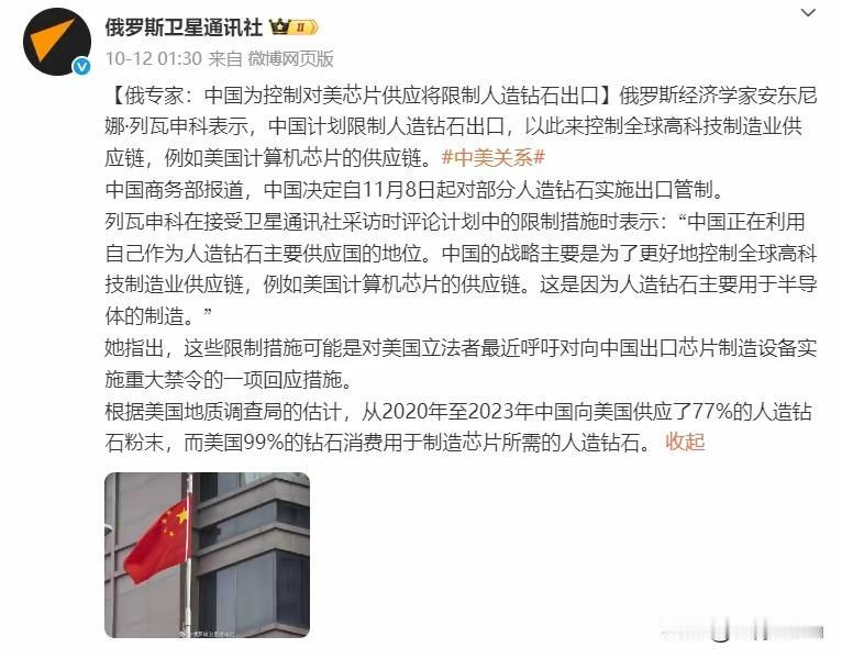 1. 中国稀土管制加码后又亮王牌 美国政要呼吁冷静:为应对美方封锁,中国加码稀土出口管制,还有更重要底牌人造钻石——未来半导体核心材料,中国占全球七成以上产能,比稀土反制更致命,美国政要万斯呼吁克制,这是对美技术围堵的有力回应。