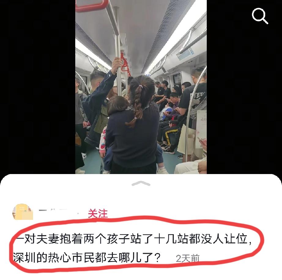 11月14日,深圳。网友发视频吐槽:一对夫妻抱着两个孩子站了十几站都没人让位,深圳的热心市民都去哪儿了? 评论区网友表示: 要是抱娃的站我边上 我是真坐不住。现在的人心怎能凉薄如此? 也有网友表示:在我看来,这种现象肯定是极个别的,我相信绝大部分看到这种情况肯定是会主动让座的。而发布的这个网友的这句话“深圳的热心市民都去哪儿了”,让他们深圳人听上去肯定很刺耳的。 各位看官,你们怎么看这个现象?