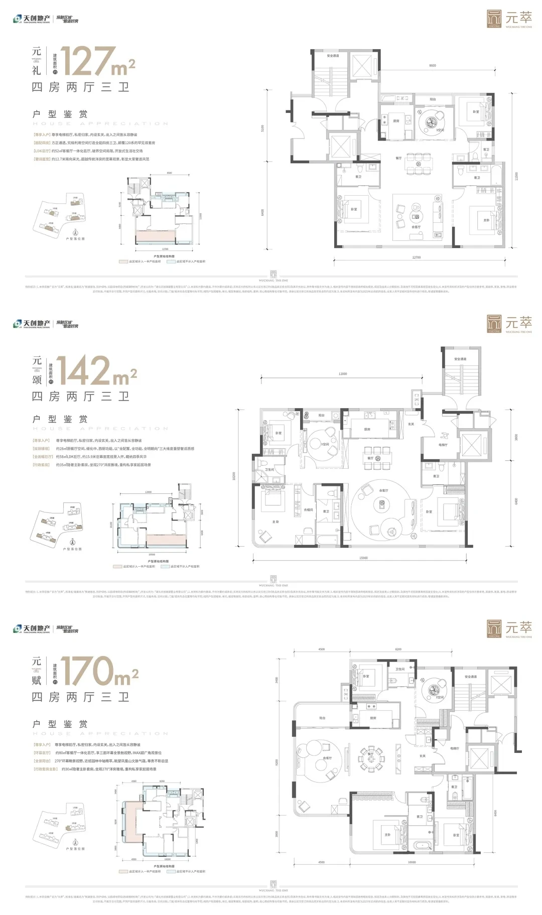 有127、143、170三个户型,均为4房3卫的设计,整体户型设计都相对不错,尺度感和功能性都能够保证