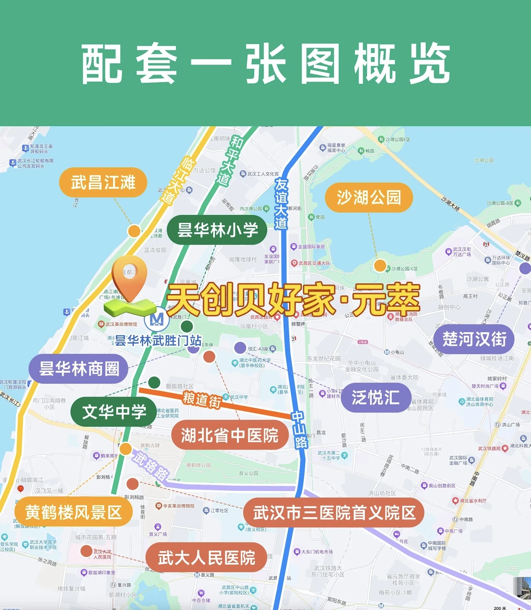 200米左右到武昌滨江、出门就是昙华林和辛亥革命博物馆、1.1公里到黄鹤楼,昙华林商圈,楚河汉街商圈,武昌滨江商圈都在地铁三站内,配套齐全