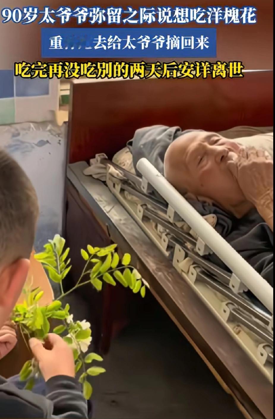 90多岁的老人 在临终的前几天想吃槐花 他的重孙摘来槐花给他 这位老人吃完槐花后就没有再吃过其他的东西 没几天就离开了人间 我想这位老人是有福气的,在有槐花的季节吃上了重孙为他摘来的槐花 孩子也是有福气的,满足了太爷爷最后的愿望