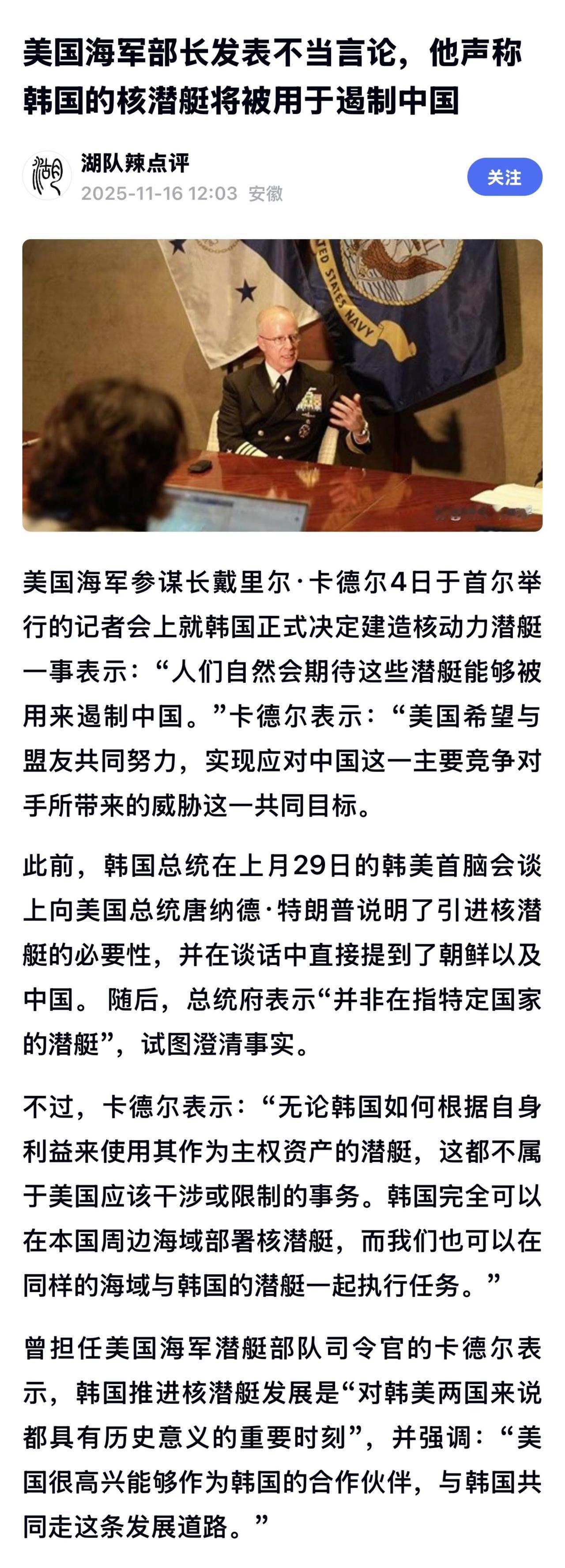 卡德尔说,美国希望韩国最终部署新批准的核动力潜艇,这是对重要盟友的合理期望。 他强调:“韩国有责任在全球范围部署这些潜艇,实现从区域性海军向全球性海军的转型。” 美韩11月14日宣布正式敲定《联合情况说明书》,内容包括美方批准韩国建造核动力潜艇,并将在燃料供应方面与韩方紧密合作。