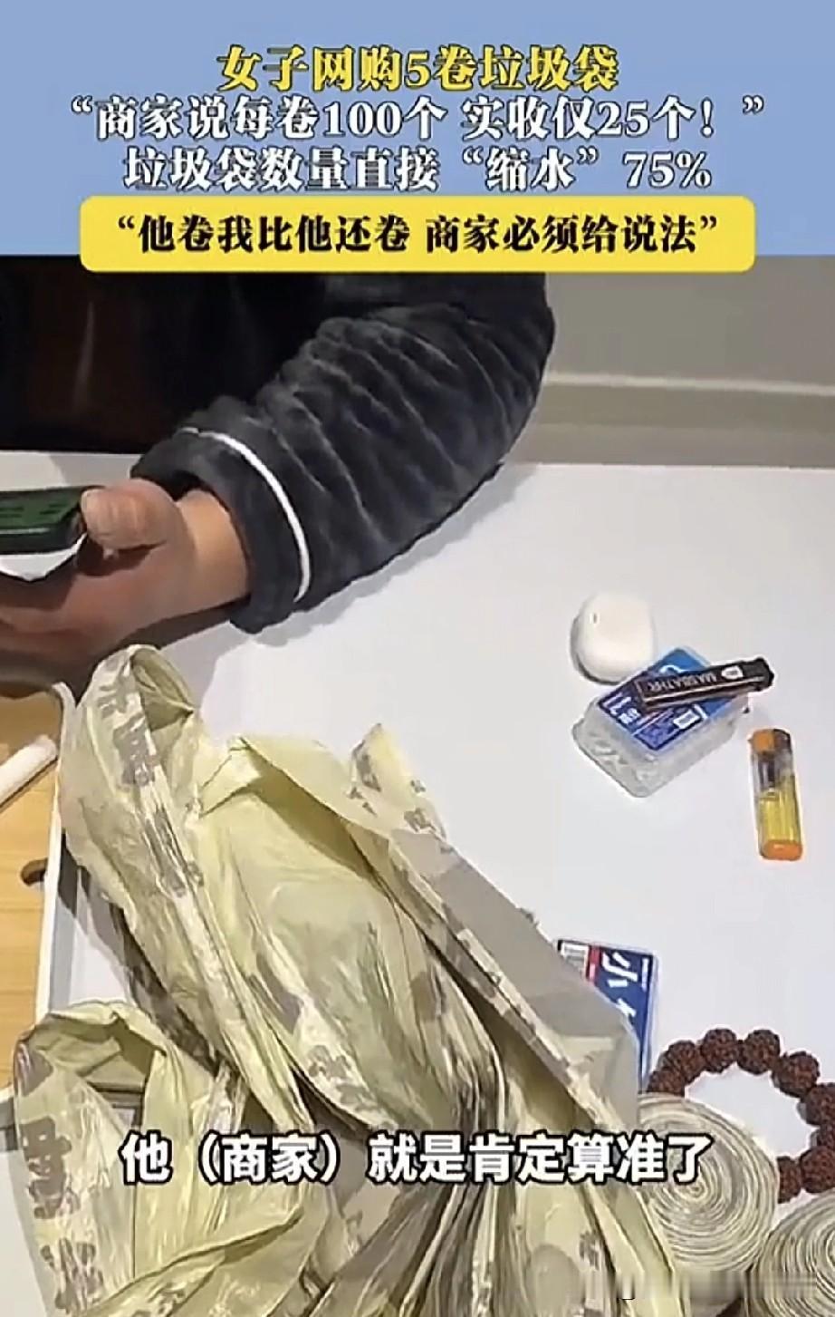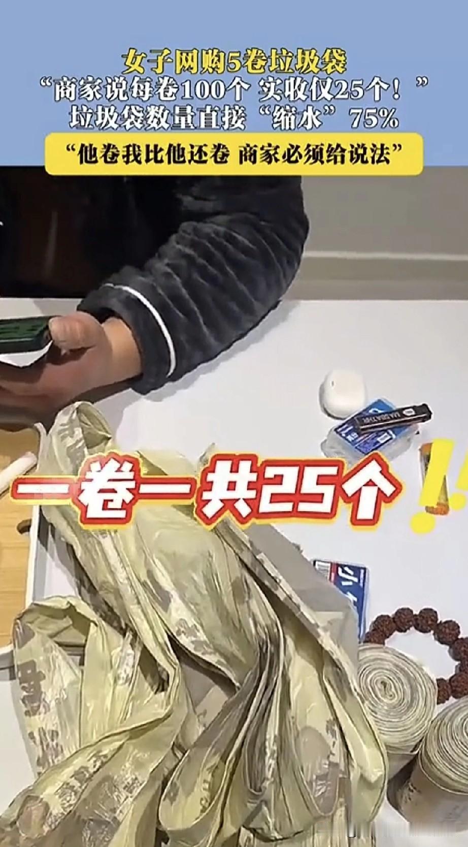 女子发视频曝光售卖垃圾袋的商家。据女子介绍,她在网上直播间看到主播推销,19.5元能买五捆垃圾袋,主播还称每卷垃圾袋有100个,五卷能用一年。女子轻信了主播的话,便下了单。 收到货后,女子心生怀疑,打开一卷垃圾袋逐个清点,发现每卷仅有25个。商家本以为买家不会拆开查看,却不料碰到了如此较真的女子。垃圾袋数量直接减少了75%,女子表示一定要讨个说法,要么退货,要么商家道歉。 商家是不是算准了100个人里只有一两个人会拆开检查?即便给这几个人退款,他们也照样能盈利。 这都是套路。我也有过类似经历,具体花了多少钱记不清了,同样是五卷,宣传每卷100只。我闲来无事拆开一卷数了数,结果一卷只有50只。我联系客服,人家二话不说就要给我退一半的钱,我没同意,质问他们老老实实做生意不好吗?他们销量有几万单,这得骗了多少钱。我要求全额退款,结果秒退。 大家有过类似的经历吗?