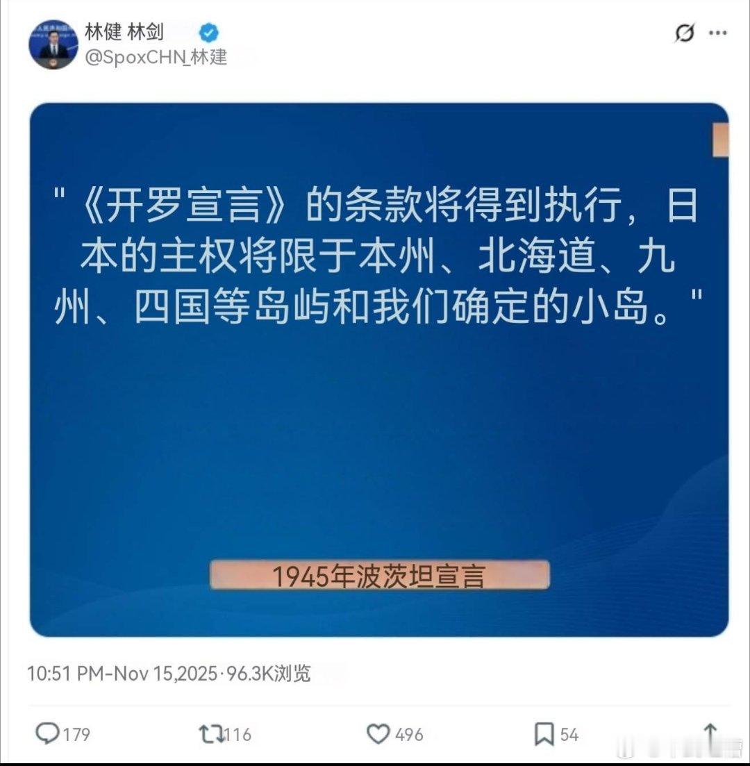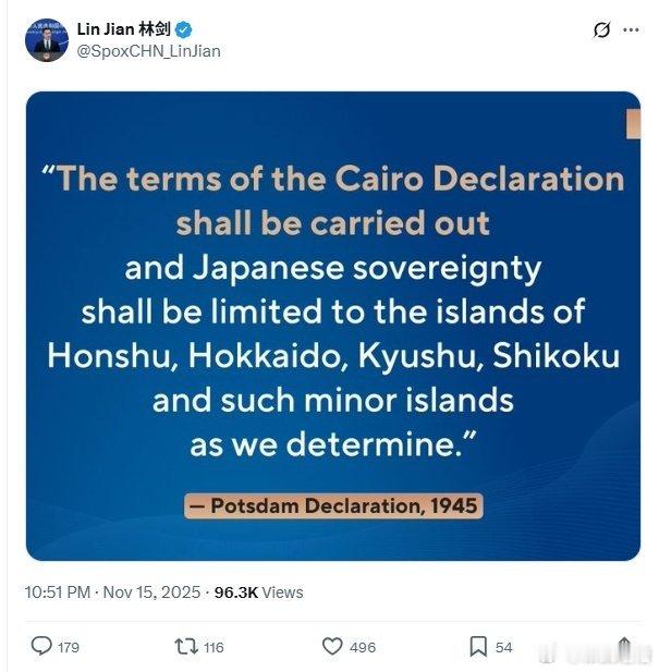 外交部发言人林剑在外网发了条消息:根据波茨坦公告,日本的国土仅限于本州、四国、九州、北海道四岛这意思已经很明确了,琉球不属于日本,未来必须独立!