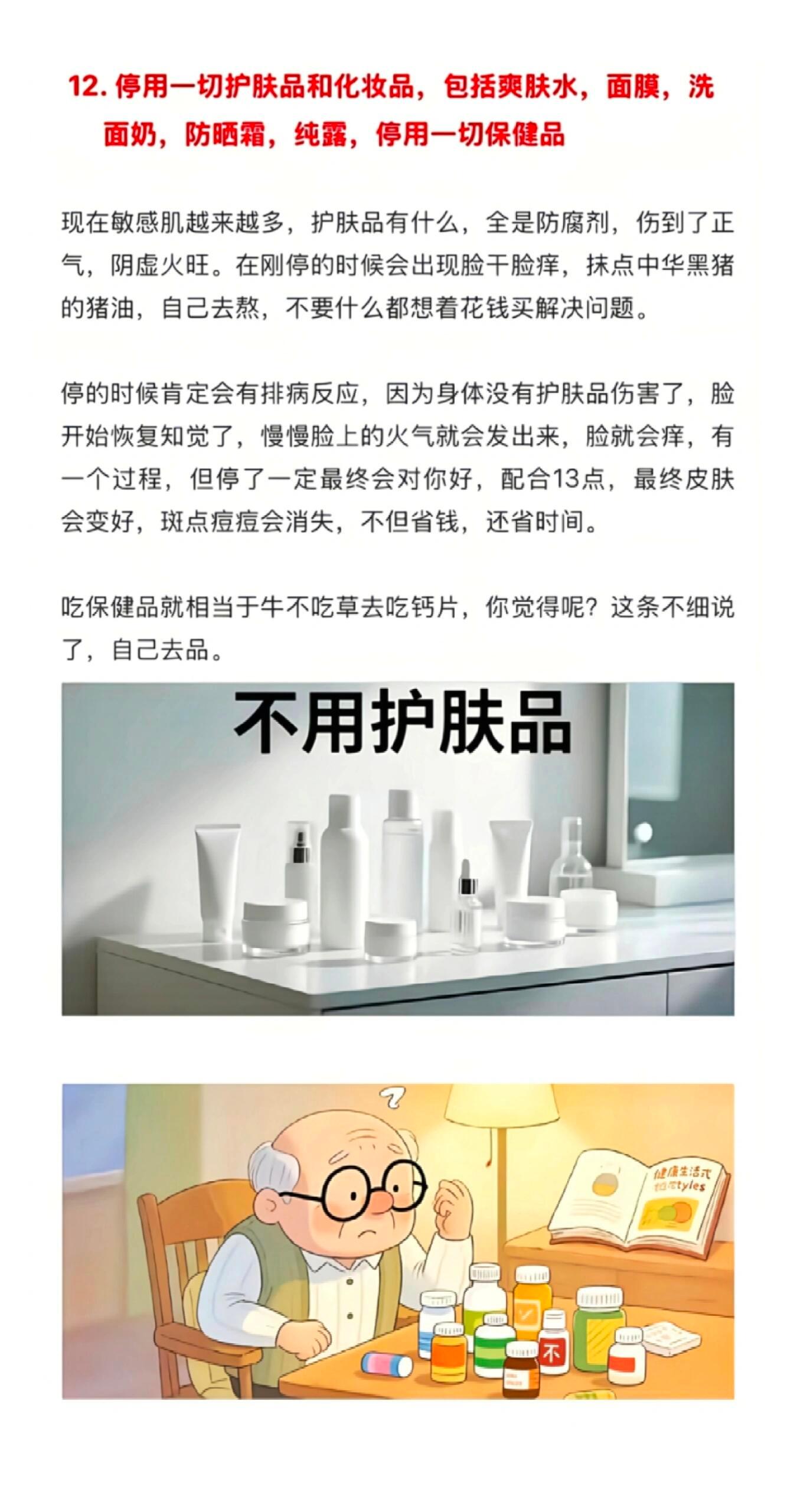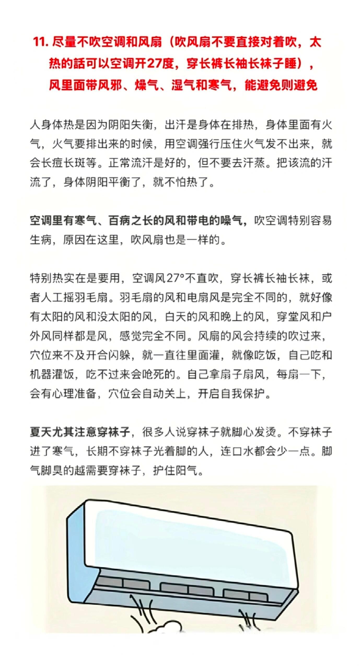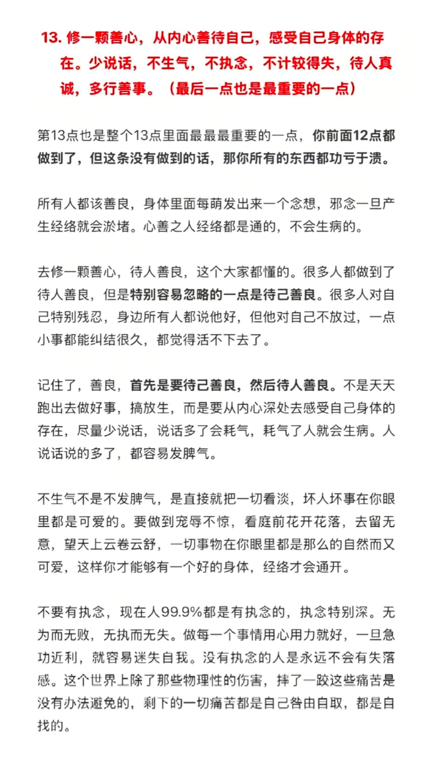 养生十三点(10-13),很全面。10.太阳落山前2小时解决肚子饿的问题(尽量过午不食),太阳落山后不吃任何东西,实在顶不住可以吃梨粥、萝卜粥、红糖藕粉代替;太阳落山2小时后不喝水;太阳落山后3小时内入睡;11.尽量不吹空调和风扇(吹风扇不要直接对着吹,太热的话可以空调开27°C,穿长裤长袖长袜子睡),风里面带风邪、燥气、湿气和寒气,能避免则避免;12.停用一切护肤品和化妆品,包括爽肤水、面膜、洗面奶、防晒霜、纯露,停用一切保健品;13.修一颗善心,从内心善待自己,感受自己身体的存在。少说话,不生气,不执念,不计较得失,待人真诚,多行善事。(最后一点也是最重要的一点)