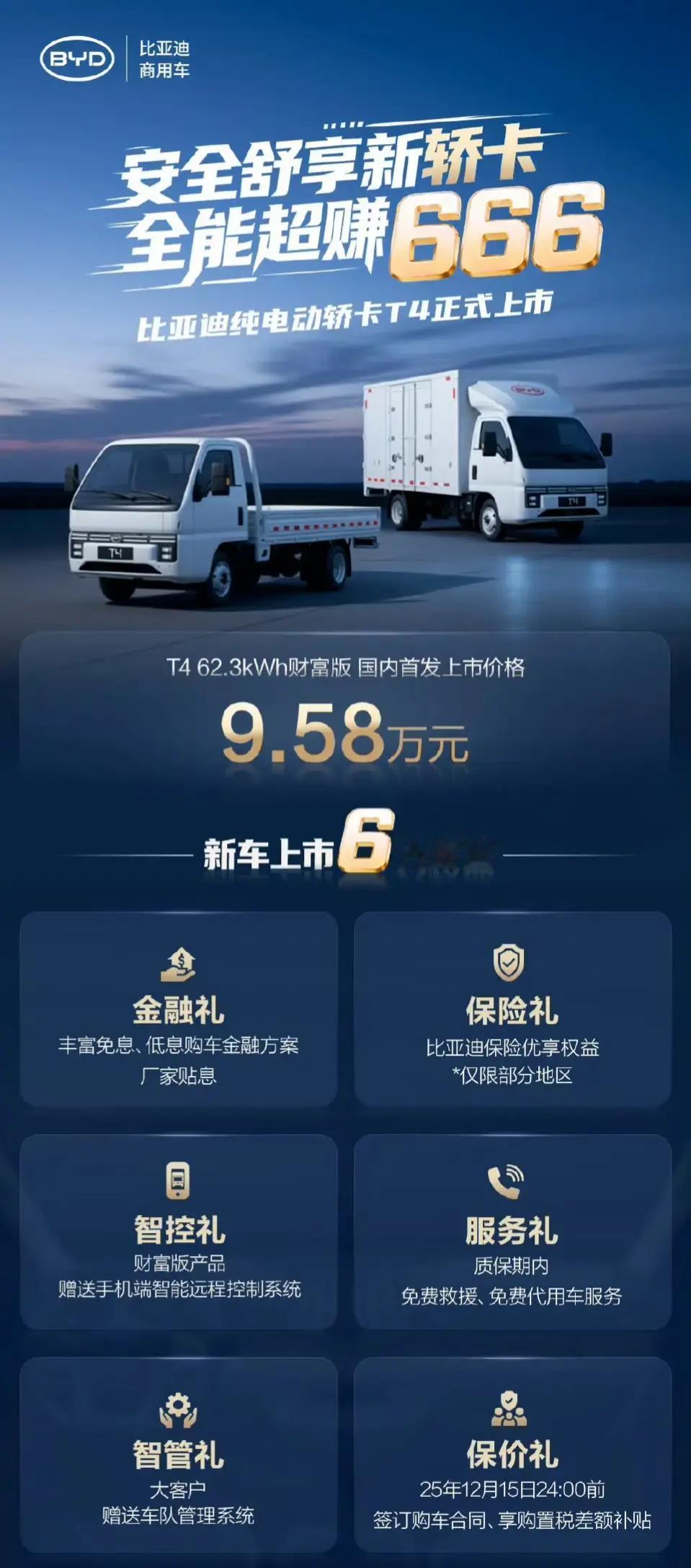 比亚迪轿卡T4上市售价9.58万起!62.3kWh刀片电池,CLTC续航330km150kW扁线电机、204匹马力、340N·m3吨级矩形大截面后桥,承载同级提升20%灵犀电刹、刀片电池CTC底盘一体化设计标配X-EPS转向系统,超强度钢笼车身三电系统10年/80万公里超长质保 比亚迪新能源汽车做的是真大呀,大巴,牵引车,家用车,货车。跑车,豪华品牌,云轨,手机代工等。厉害了我的比亚迪