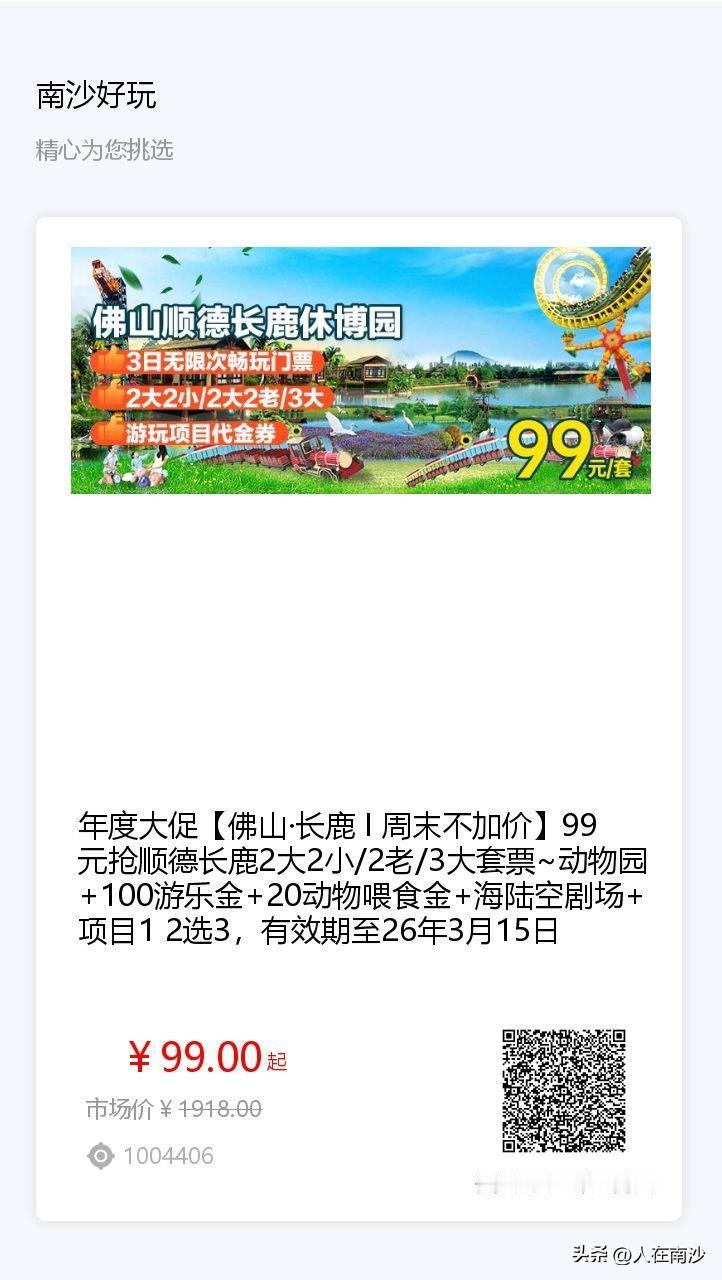 长鹿大促加码!99元2大2小或2大2老或3大,重要的是3天不限次出入,一次玩个够。 南沙1小时车程,被称为南沙人的长隆。长鹿年底大促,99元2大2小或者两2大2老,项目十分丰富,一天压根玩不完,所以这次团购门票可以3天内不限次使用,也就是说可以出去吃吃喝喝,在周边住一晚两晚,一次玩个够。还送了很多收费项目的代金券游乐金。 真的是超级实惠的,错过等一年。 剁手方法:保存图片,微信wx 扫一扫打开即可。