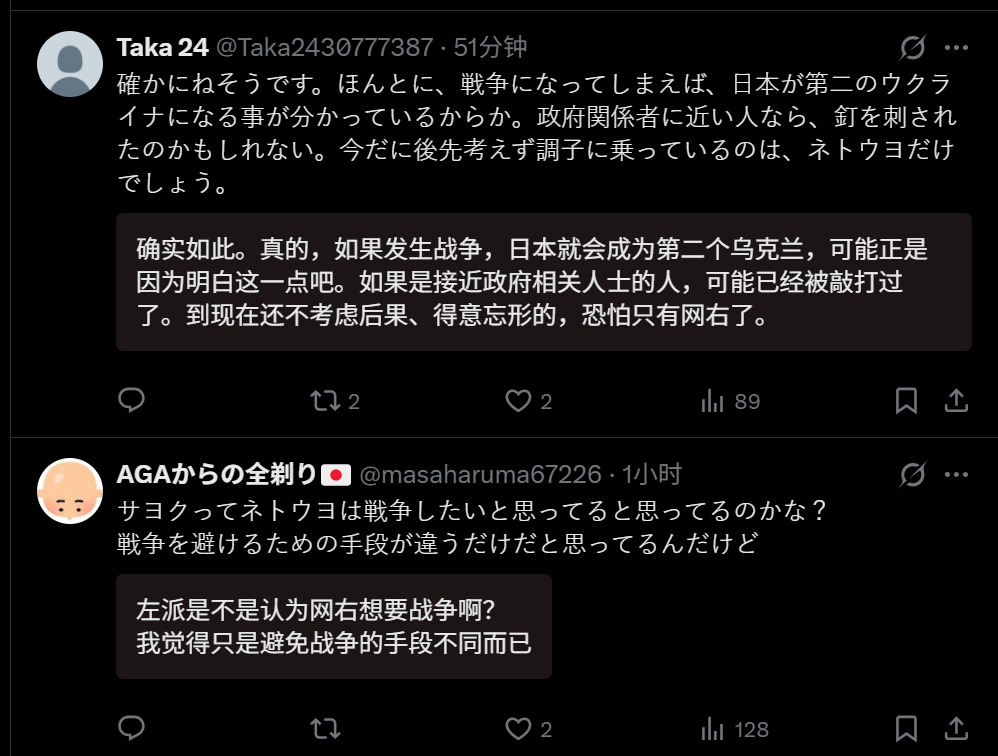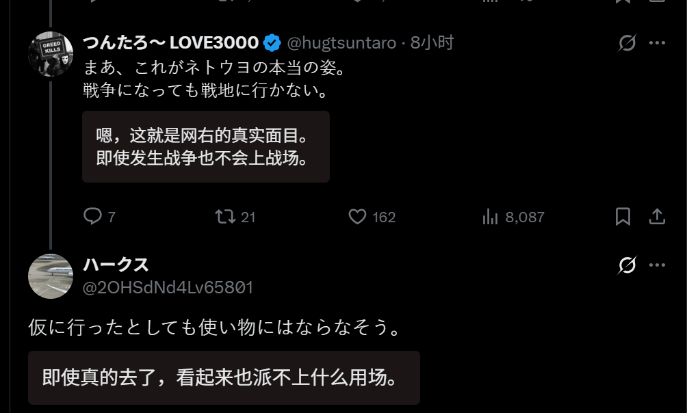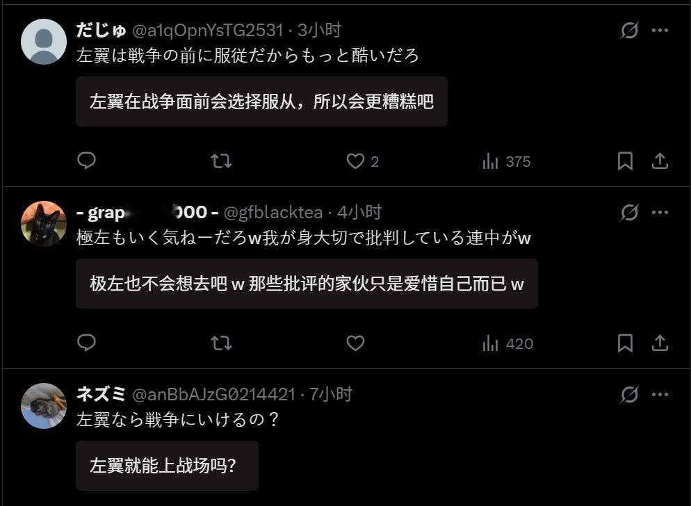 🔻网友分享:日本左翼骂网络右翼不愿意上战场、“突然这个时候劝大家要冷静了”。🔻然后日本网络右翼回嘴:“即使(我们)真的去了,看起来也派不上什么用场。你们左翼难道就想上战场吗?”🔻所以说,真到要上战场的时候,无论左右的日本人就突然怂了吗?