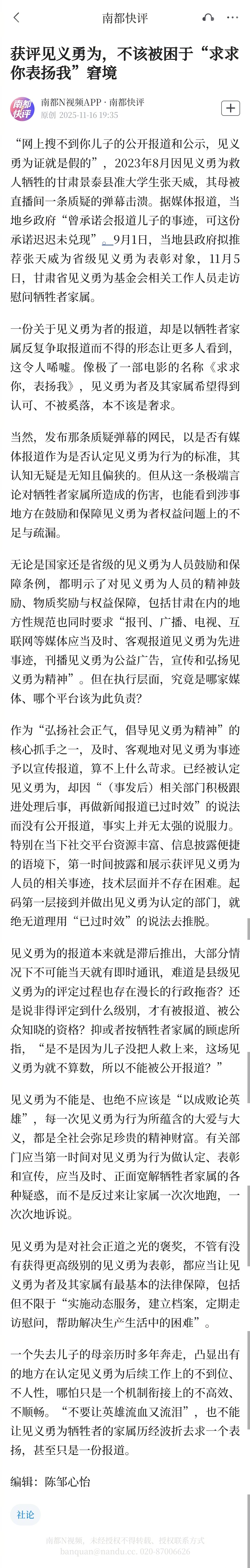 【南都快评:获评见义勇为,不该被困于“求求你表扬我”窘境】“网上搜不到你儿子的公开报道和公示,见义勇为证就是假的”,2023年8月因见义勇为救人牺牲的甘肃景泰县准大学生张天威,其母被直播间一条质疑的弹幕击溃。据媒体报道,当地乡政府“曾承诺会报道儿子的事迹,可这份承诺迟迟未兑现”。9月1日,当地县政府拟推荐张天威为省级见义勇为表彰对象,11月5日,甘肃省见义勇为基金会相关工作人员走访慰问牺牲者家属。一份关于见义勇为者的报道,却是以牺牲者家属反复争取报道而不得的形态让更多人看到,这令人唏嘘。像极了一部电影的名称《求求你,表扬我》,见义勇为者及其家属希望得到认可、不被奚落,本不该是奢求。当然,发布那条质疑弹幕的网民,以是否有媒体报道作为是否认定见义勇为行为的标准,其认知无疑是无知且偏狭的。但从这一条极端言论对牺牲者家属所造成的伤害,也能看到涉事地方在鼓励和保障见义勇为者权益问题上的不足与疏漏。无论是国家还是省级的见义勇为人员鼓励和保障条例,都明示了对见义勇为人员的精神鼓励、物质奖励与权益保障,包括甘肃在内的地方性规范也同时要求“报刊、广播、电视、互联网等媒体应当及时、客观报道见义勇为先进事迹,刊播见义勇为公益广告,宣传和弘扬见义勇为精神”。但在执行层面,究竟是哪家媒体、哪个平台该为此负责?