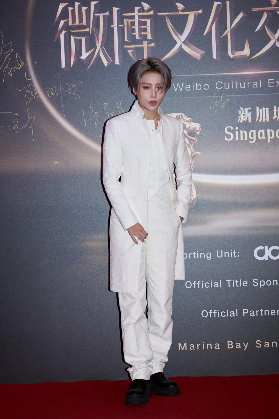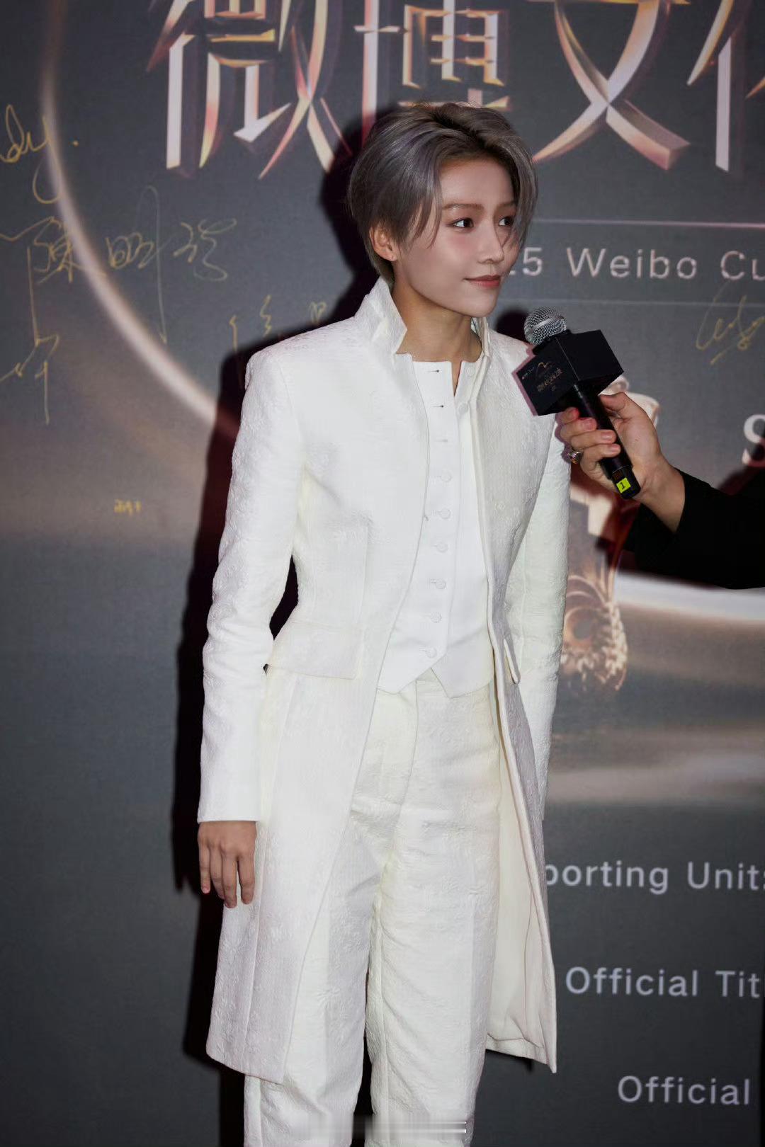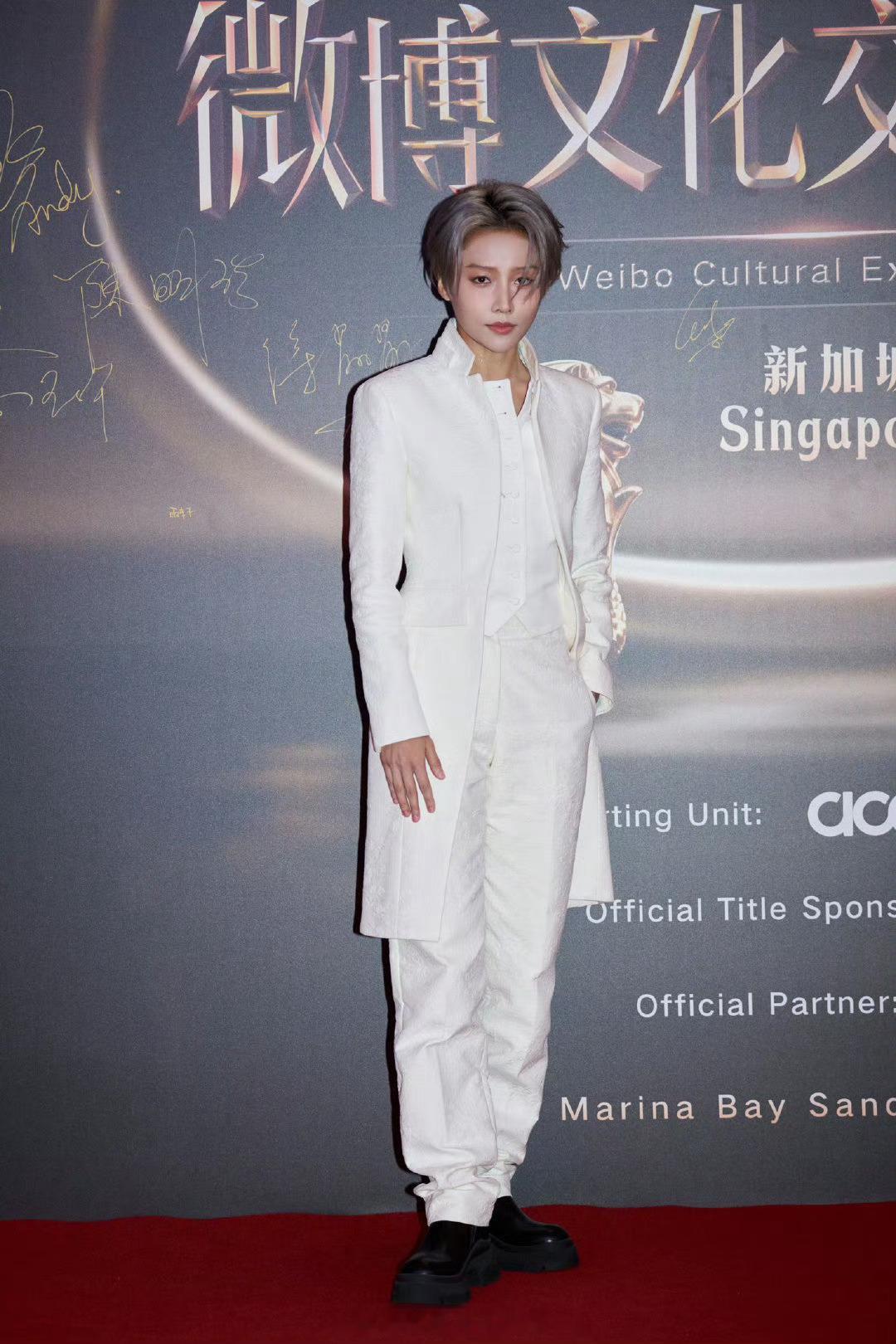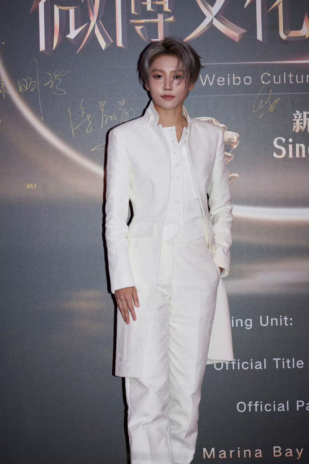 刘雨昕参加新加坡微博文化交流之夜红毯造型🈶,一身白色正装状态很好