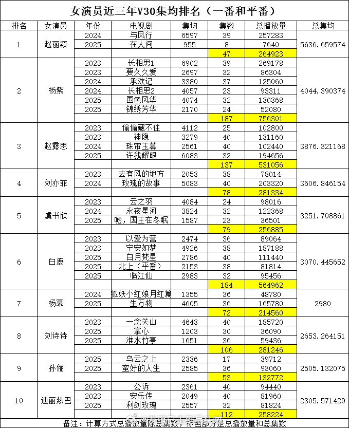 女演员近三年v30集均排名:赵丽颖、杨紫、赵露思、刘亦菲、虞书欣、白鹿、杨幂、刘诗诗、孙俪、迪丽热巴