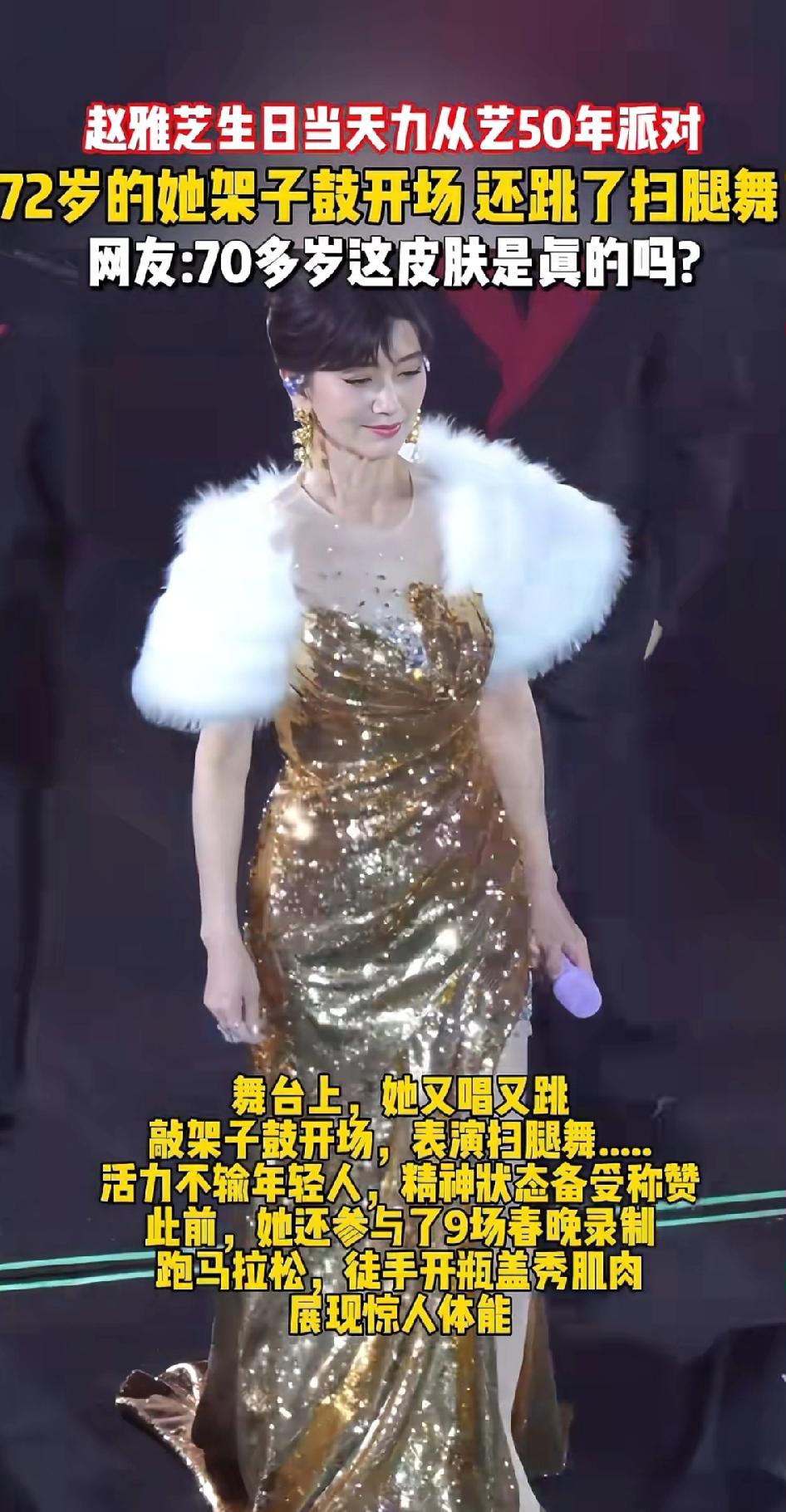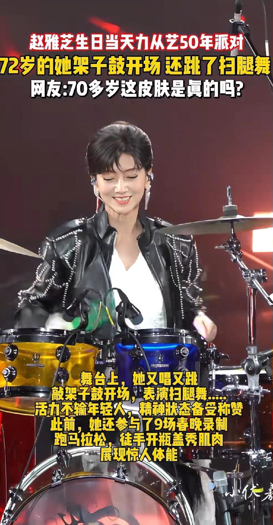 70岁正是闯的年纪啊! 赵雅芝72岁这个状态,简直不要太吓人了。 别的女明星是满50减20,赵雅芝这是满70减30吧? 别说脸蛋精致没有岁月的痕迹了,就连这身材,怎么能保持得这么好?如此玲珑有致,婀娜多姿,有前有后还有腰… 一场从艺50周年的生日派对,不仅唱歌跳舞,还以打架子鼓开场!这位姐姐,还有什么是不会的? 看来,人真的不能退休啊! 赵雅芝说她永远不会退休,我想一直工作就是她永葆青春的原因吧? 如果她60退休了,估计就不会这么自律与开心了…